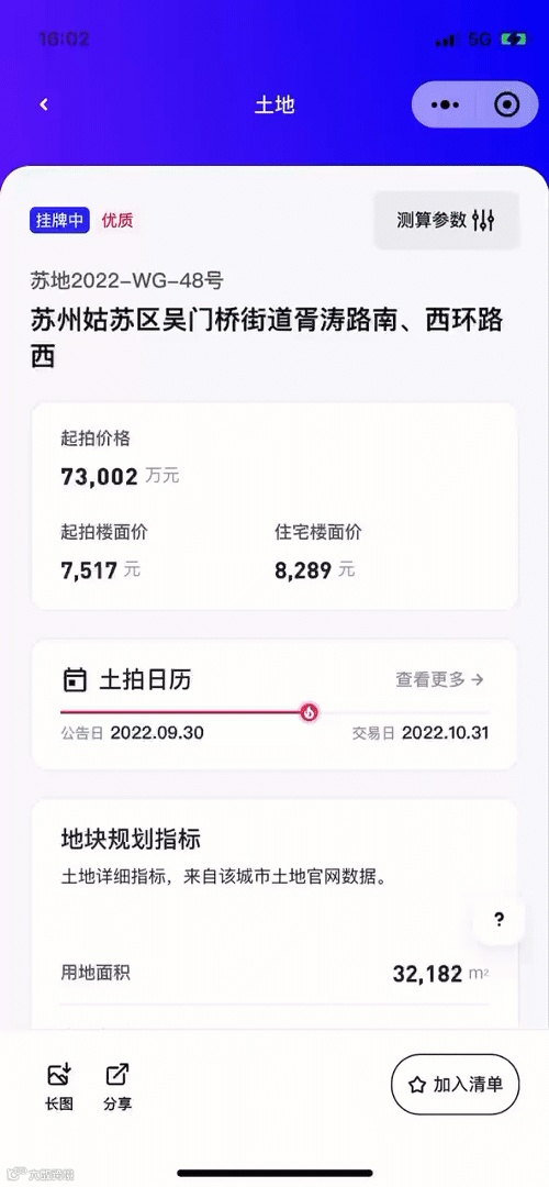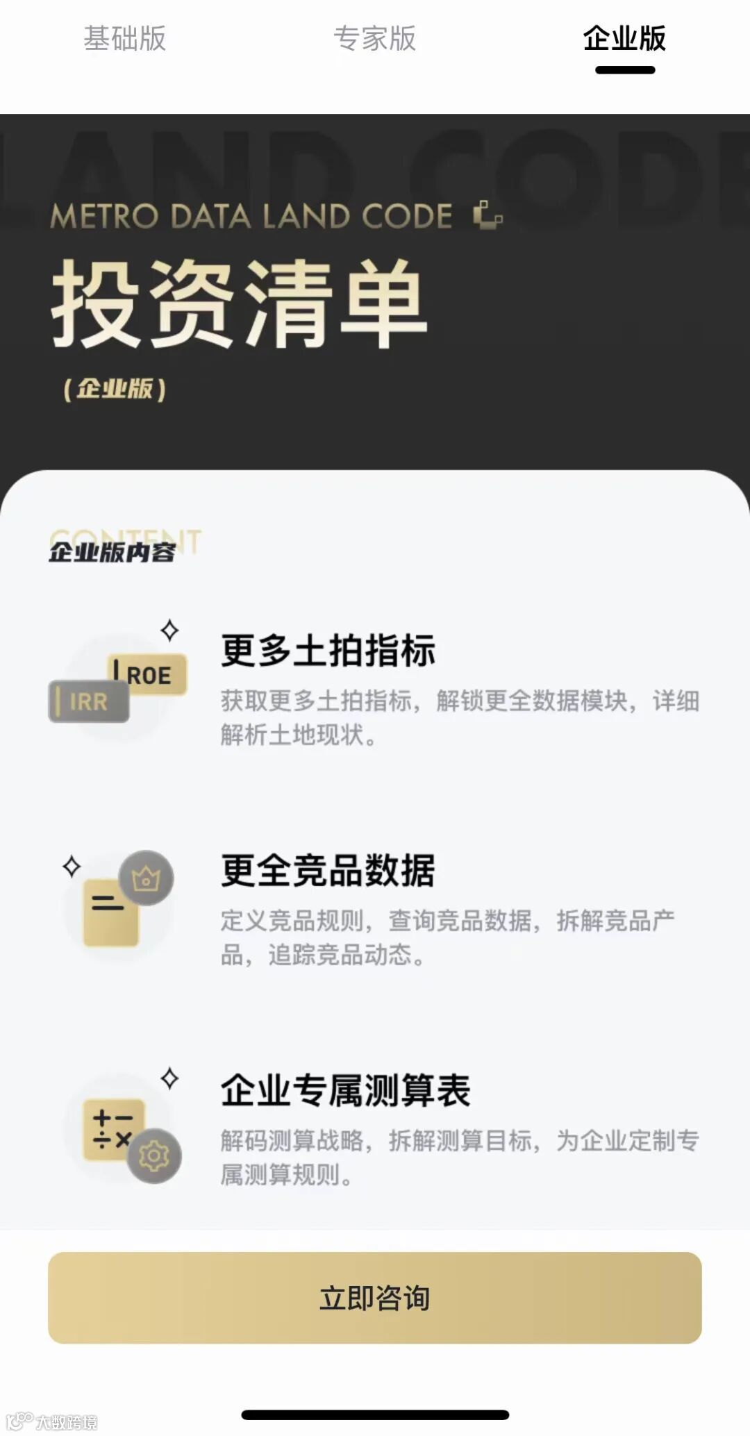 根据用户的使用习惯,投资清单在土地展示的顺序、逻辑及功能上做了更新,优先展示用户最关心的土地指标:【起拍价/成交价】【楼面价】和【竞得企业】,并增加了板块指标的解释,让用户能更好的使用数据,理解地块的定位。