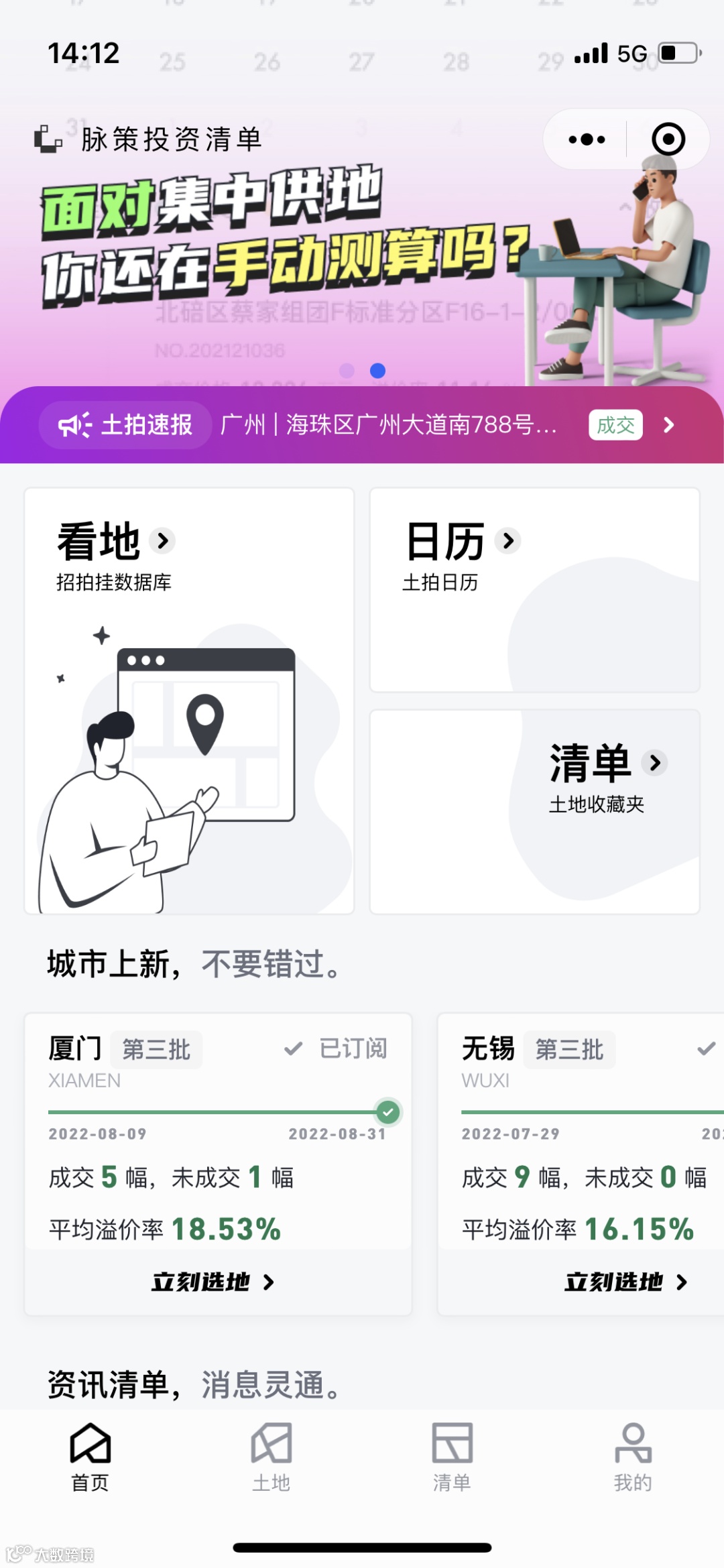 基础功能被罗列在了【看地】【日历】【清单】三个按钮,下方是最近土拍市场的时间轴,关心多城市土拍进度的朋友可以按需订阅。