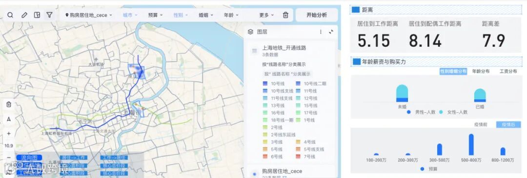 根据调研,我们还发现,上海职住与交通关联较大,环绕地铁交通线,买房、工作的偏向性更多。