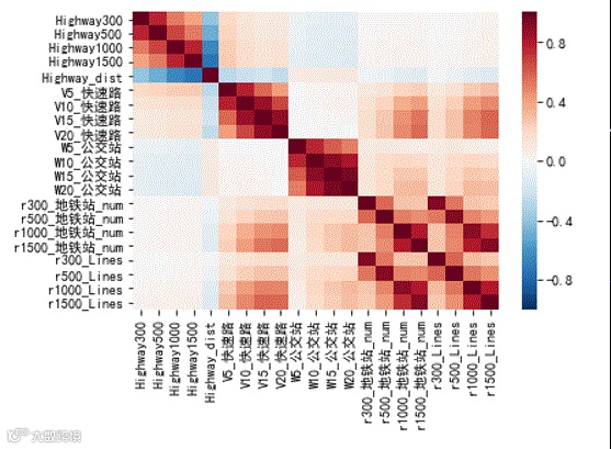 经过测算,使用“车行15分钟等时圈”内的指标时,对房价的解释度最高。同时发现,一些指标之间存在较强的共线性。据此,我们选定“车行15分钟”作为项目“周边”的地理范围,并对指标体系进一步精简。