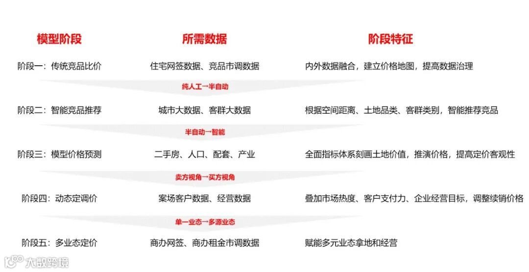 研策能力的提升,是以数据的整合以及方法论的创新为基础。万科的「定价模型」,经过了人工到数据智能的升级,实现了卖方视角到买方视角的转换,以及单一业态到多元业态的扩展。