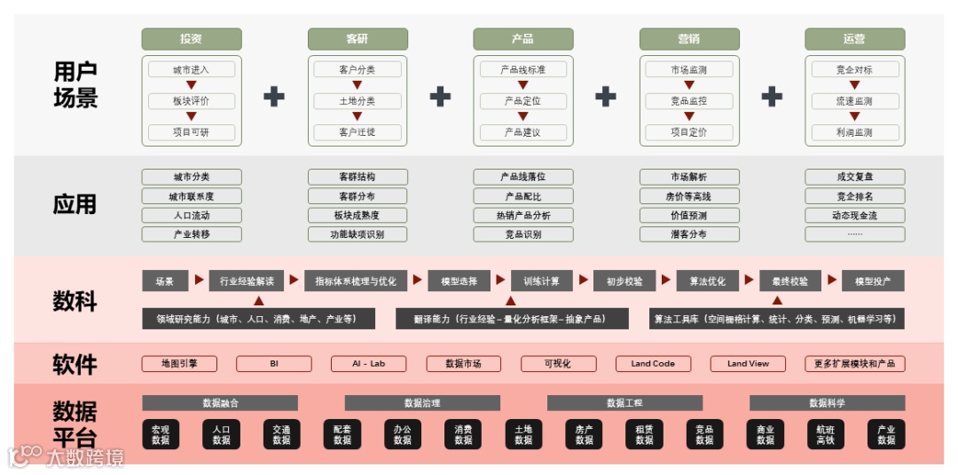 丰盈的数据生态,支撑了城市节气判断、板块投资策略、土地价值识别等12个研策模型的固化工作,并支撑了城市地图、城市宏观、城市研判、城市组合、市场监测、商业研判、板块研判、客户地图、报告中心等9大应用模块的建设和日常运转。