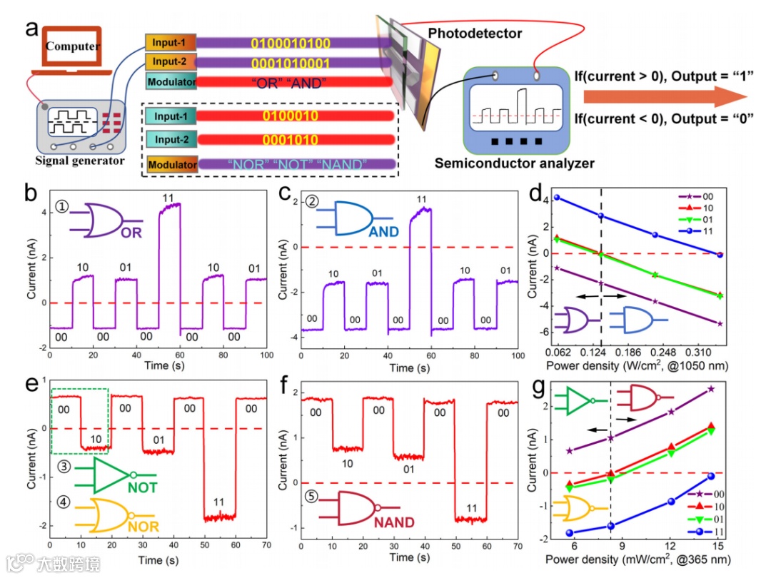 图4. 一体化光电子逻辑门。(a) 光电子逻辑运算示意图;(b) 近红外调制下紫外输入的 “或” 门 I–T 曲线;(c) 红外调制下紫外输入的 “与” 门 I–T 曲线;(d) 红外调制功率密度对应的光电流输出;(e) 紫外调制下红外输入的 “非”(“或非”)门 I-T 曲线;(f) 紫外调制下红外输入的 “与非” 门 I–T 曲线;(g) 紫外调制功率密度对应的光电流输出