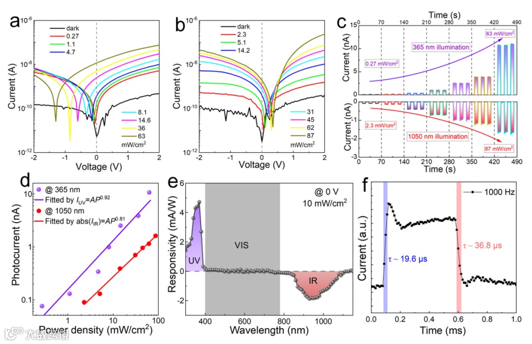 图3. GaN/ZnO:Ga/GaAs 光电探测器的光电特性。(a) 暗态及不同功率密度 365nm光照下的I-V曲线;(b) 暗态及不同功率密度 1050 nm光照下的I-V曲线;(c) 365 nm或1050 nm 光照下I-T曲线随功率密度的变化;(d) 365 nm或1050nm光照下光电流随功率密度的变化;(e) 响应度随波长的变化;(f) 调制频率为 1000 Hz 时的典型响应时间