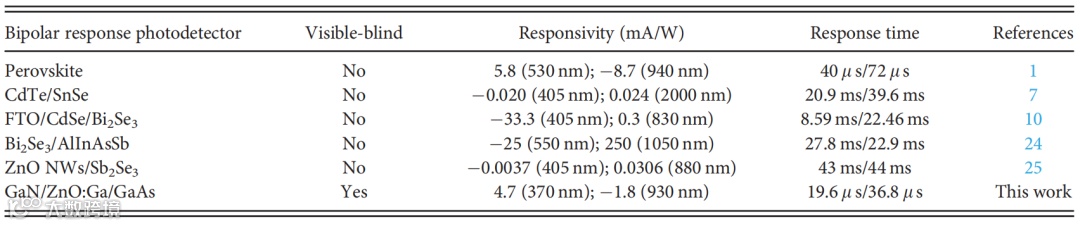 表1 典型自供电双极响应探测器关键参数对比