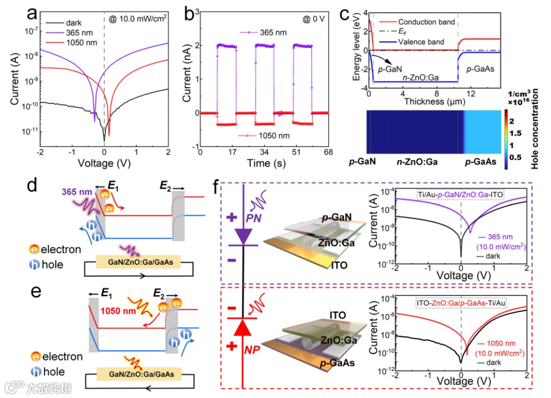 图2. GaN/ZnO:Ga/GaAs光电探测器的光电特性与工作机制。(a)暗态及光照(365nm和1050nm,10mW/cm²)下的I-V曲线;(b)零偏压下光照开关的I-T曲线;(c)平衡态能带图,底部为空穴浓度模拟;(d)(e)分别为365nm和1050nm光照下的工作机制:红色箭头表示电子流向,蓝色箭头为空穴流向,底部为外电路电流方向;(f)两个异质结(PN结和NP结)的串联等效电路:上下部分分别展示p-GaN/ZnO:Ga和ZnO:Ga/p-GaAs探测器的结构示意图及I-V曲线