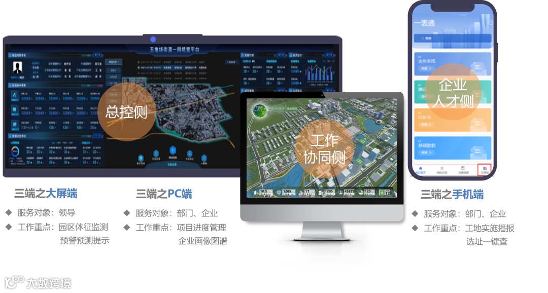 最终,产品实现了三对象(领导、企业、部门)在三端(大屏端、PC端、手机端)无缝衔接的产业全链路闭环应用。
