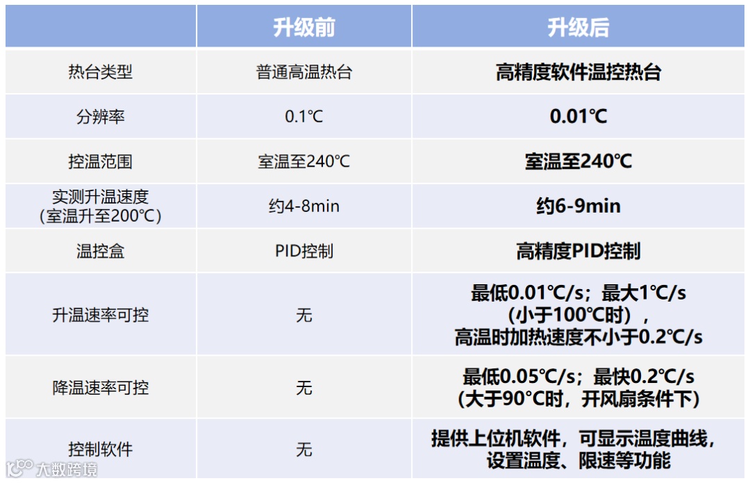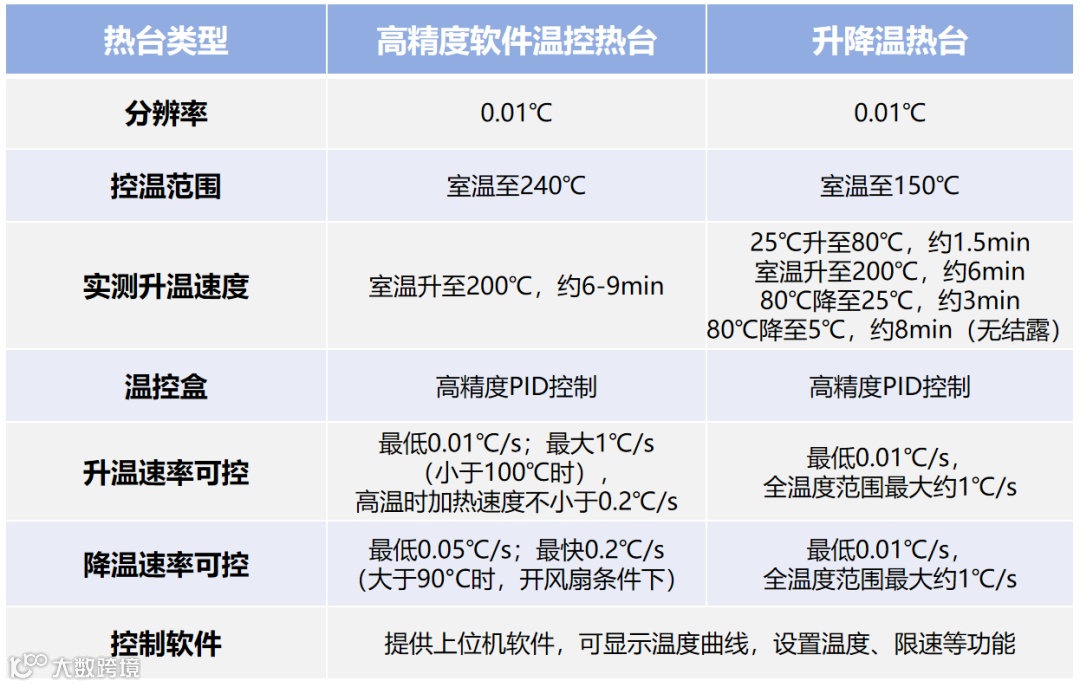 我们同时能提供,最低温可达5℃的特殊升降温热台升级,参数对比详见表格: