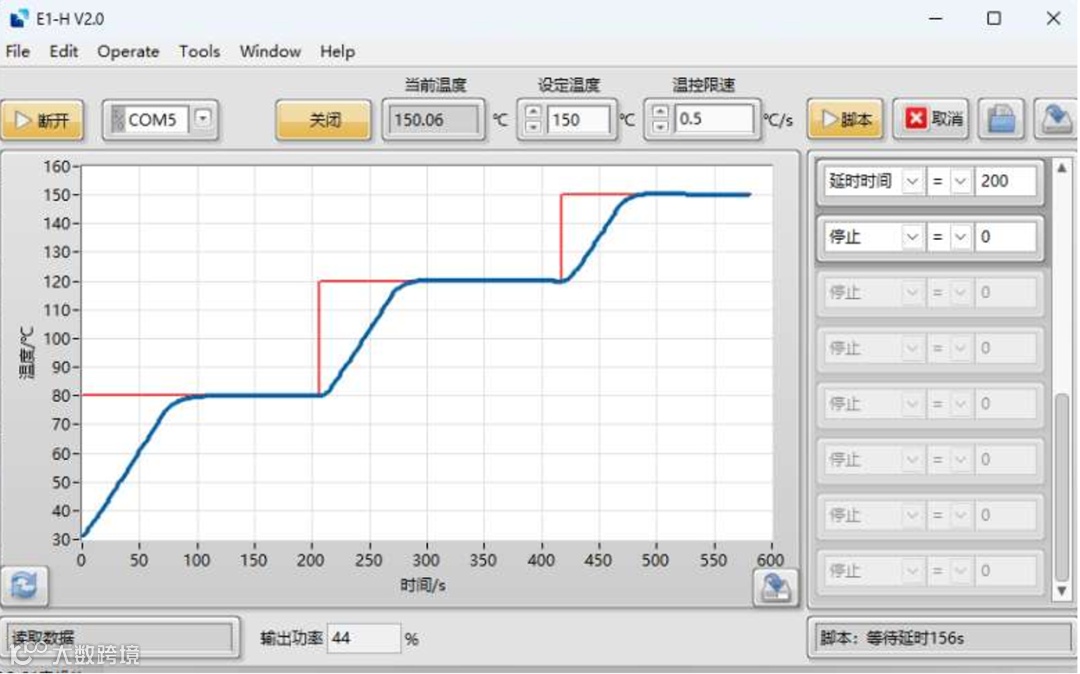 图示显示设置为:0.5℃/s 升温至 80℃,延时200s,再升温至 120℃,延时200s,再升温至 150℃,延时200s,停止;