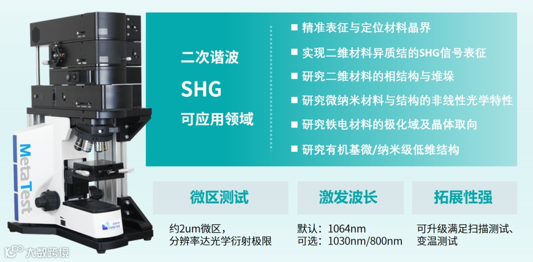 EasySpec SHG二次谐波光谱测试系统将皮秒超快激光集成进入显微光路,通过100倍物镜聚焦于样品表面,激发样品的微区二次谐波,可以对样品的晶格取向、晶界分布以及原子层数、原子层排列方式做无损测试。