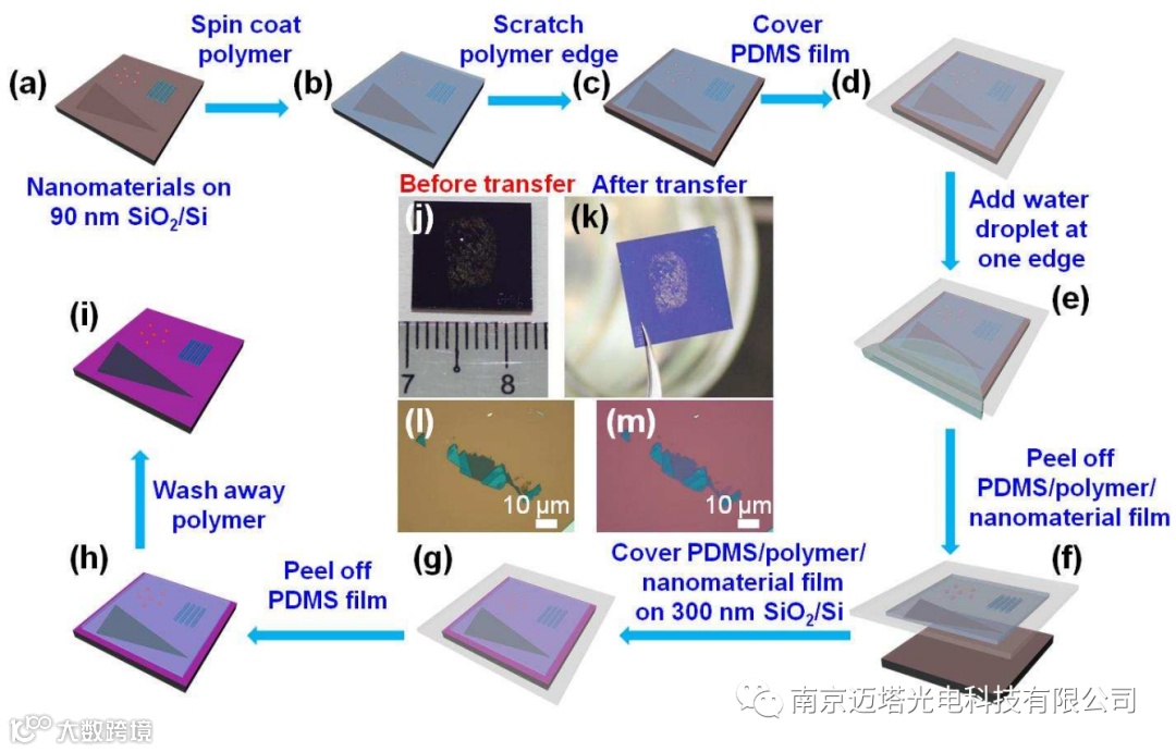 如图2F所示,首先利用表面能辅助法将二维材料与聚合物一起从衬底脱离漂浮在水的表面上。利用吸管除去一定的水之后,当聚合物与衬底之间的垂直距离足够近时就可以通过位移台上装配的探针控制聚合物及二维材料位置,并且将目标材料转移到特定位置上方。这一方法可以实现一系列纳米结构的转移,比如金属电极的转移以及纳米结构图案的转移。
