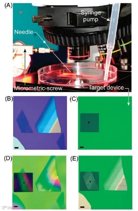 如图2A所示为文章[1]中所利用的转移设备。在含有水的培养皿中放入目标衬底,再通过表面能辅助方法将带有二维材料的聚合物漂浮在衬底上方,并转移到光学显微镜下实时观察二维材料位置。利用吸管慢慢吸收培养皿中的水,使得聚合物慢慢靠近目标沉底,当聚合物与衬底足够近的时候,可以通过在三轴位移台固定的探针操控聚合物的位置,将二维材料移动到衬底的目标位置上方并慢慢进行贴合,完成转移。