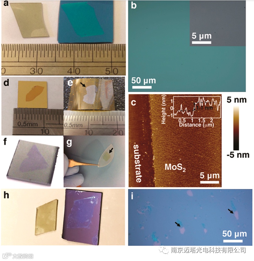 如图5所示,此方法可以将二维材料转移至多种衬底上方。图5a所示为蓝宝石衬底生长的MoS2薄膜转移至硅片上的照片。图5d,e,f,g分别为转移至金薄膜,聚酰亚胺薄膜,玻璃碳,石英的照片。并且通过与衬底刻蚀方法转移的效果(图5h,i)相比较,可以看出表面能辅助方法转移的MoS2的薄膜具有更好的晶体质量(图5a,b),转移过后的MoS2薄膜是连续并且完整的。