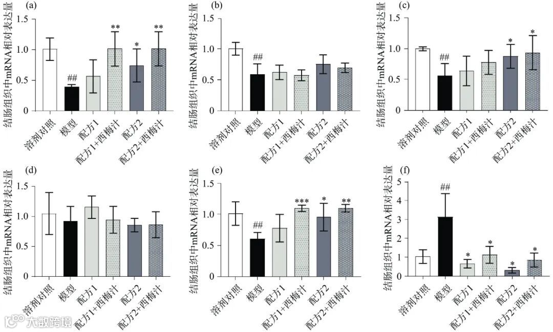 如图 4 所示,模型组 MUC2、Claudin、Occludin、SCF mRNA 相对表达量显著下降(图 4a~c、e,P<0.05),AQP3 mRNA 相对表达量高度显著上升(图 4f,P<0.01),表明便秘造成了肠道屏障损伤。而灌胃复配益生元和西梅汁后,相对于模型组,所有干预组都上调了 MUC2、Occludin、SCF 的 mRNA 相对表达量,并显著下调了 AQP3 的 mRNA 相对表达量(P<0.05)。其中配方 1+西梅汁显著上调了 MUC2、SCF 的 mRNA 相对表达量(图 4a、e,P<0.05),配方2 显著上调了 MUC2、Occludin、SCF 的 mRNA 相对表达量(图 4a、e、f,P<0.05),配方 2+西梅汁显著上调了 MUC2、Occludin、SCF 的 mRNA 相对表达量(图 4a、e、f,P<0.05)。