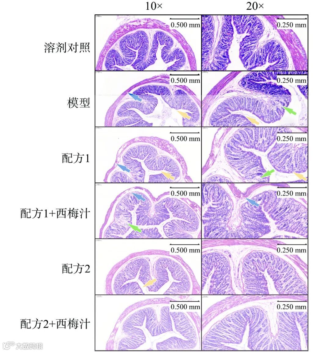 洛哌丁胺诱导的便秘会伴随着肠道肌肉层变薄,肠腺损伤和杯状细胞减少,这些变化会进一步损伤肠道粘液层,减缓肠道蠕动力,进而加重便秘症状。由图 5 所示,相对于溶剂对照组,模型组中出现了结肠肌肉层变薄(蓝色箭头)成熟杯状细胞减少(黄色箭头),肠腺排列不整齐(绿色箭头)说明便秘减少了肠道内粘液分泌,并对结肠组织造成了损伤。使用复配益生元与西梅汁干预后,相比于模型组,配方 1、配方 1+西梅汁组结肠组织损伤情况仍然较重,依然可见结肠肌肉层变薄(蓝色箭头)成熟杯状细胞减少(黄色箭头)和肠腺排列不整齐(绿色箭头)。配方2 和配方 2+西梅汁组结肠组织损伤情况较轻,偶见成熟杯状细胞减少(黄色箭头)。结果显示,益生元配方 2 和配方 2+西梅汁可以较好地缓解便秘对小鼠结肠组织造成的损伤。
