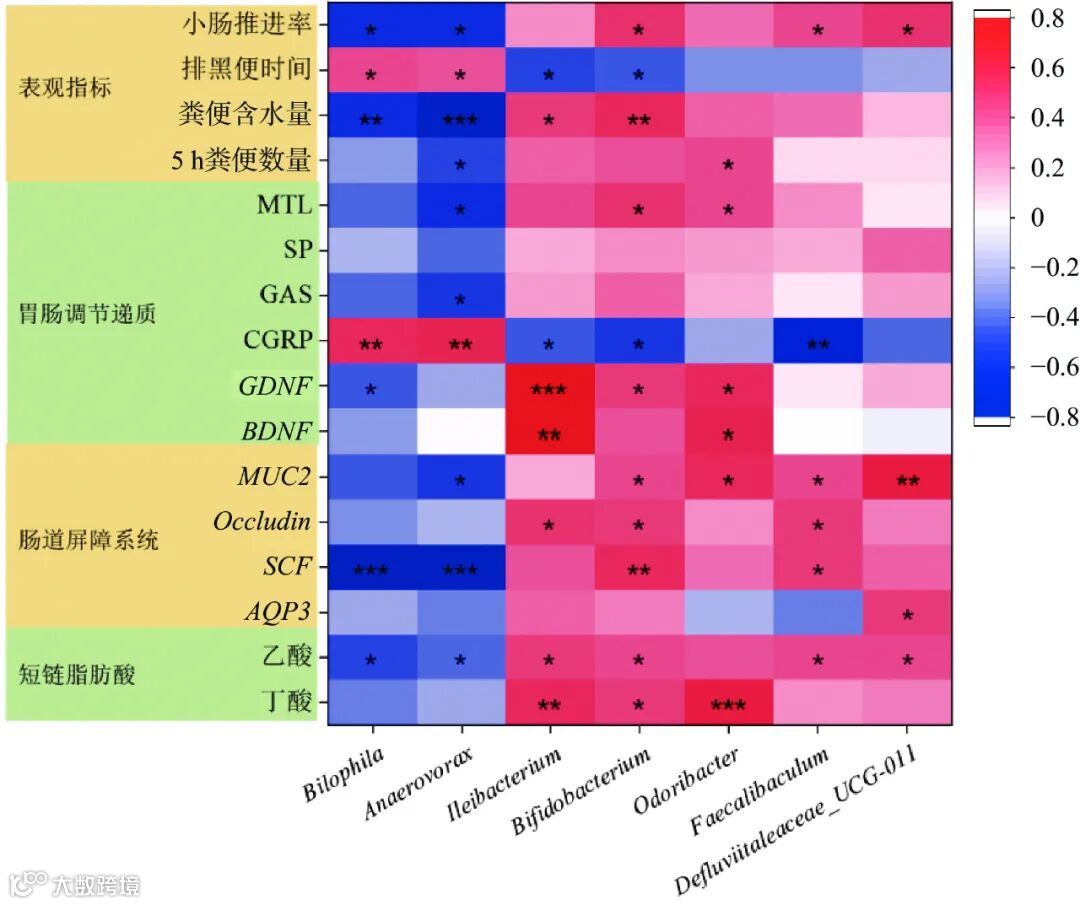 中 Odoribacter 的相对丰度与 5 h 粪便量,结肠内MTL 含量、GDNF、BDNF、MUC2 的 mRNA 相对表达量和粪便内丁酸含量呈显著正相关(图 10,P<0.05)。