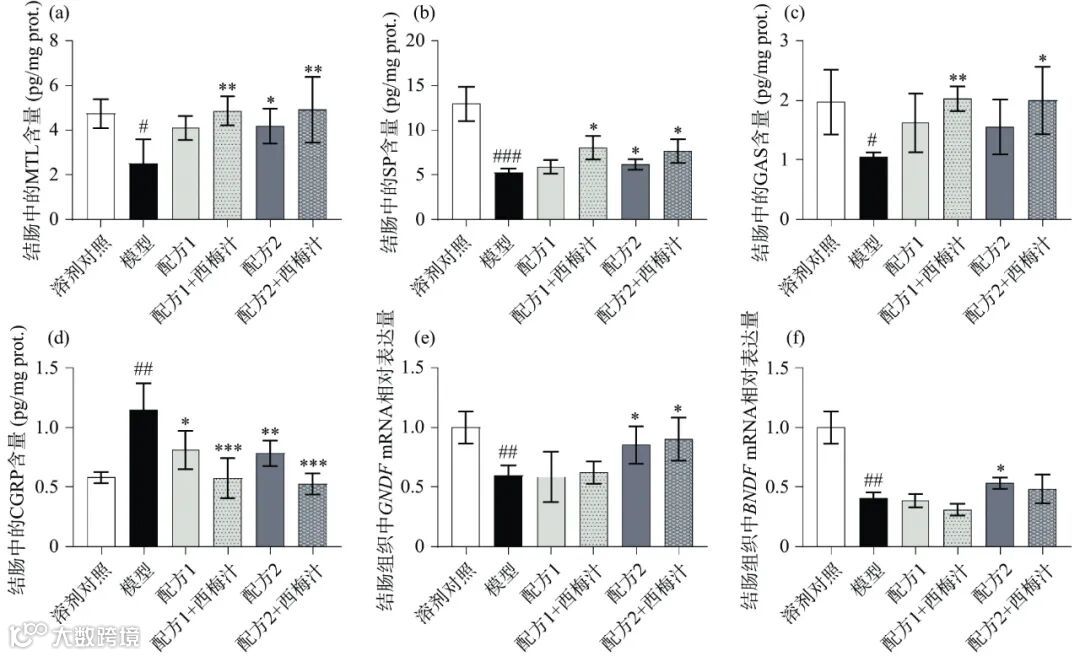 如图 3 所示,模型组小鼠结肠组织中神经营养因子 GDNF、BDNF 的 mRNA 相对表达量高度显著降低(图 3e、f,P<0.01)。这与张童等的发现一致。使用复配益生元与西梅汁干预后,配方 2 显著上调了结肠组织中 GDNF 和 BDNF 的 mRNA 相对表达量(图 3e、f,P<0.05),配方 2+西梅汁显著上调了结肠组织中 GDNF 的 mRNA 相对表达量(图 3e,P<0.05),而对 BDNF 的 mRNA 相对表达量只有上调的趋势,没有显著性差异。