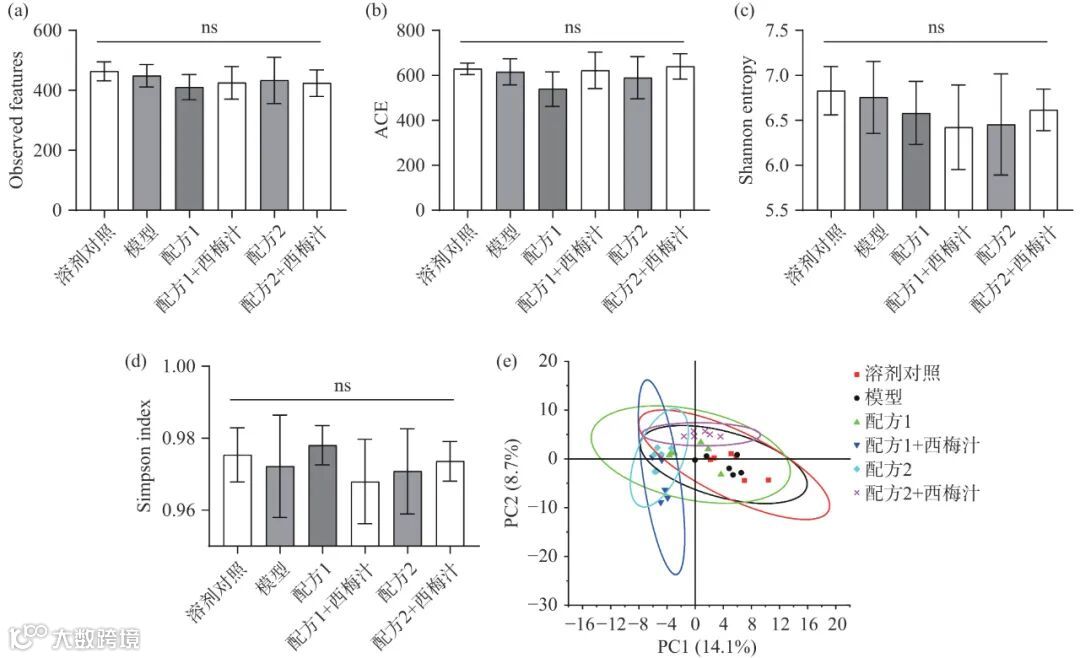 上述结果说明了益生元配方可以通过调节胃肠调节递质改善便秘,其中配方 2 对所有胃肠调节递质的调节能力都强于配方 1。张华南等也发现,低聚木糖、水苏糖等益生元可以通过上调兴奋性胃肠调节递质,下调抑制性胃肠调节递质,缩短排首粒黑便时间,缓解便秘。配方 1 不能显著调节兴奋性胃肠调节递质(MTL、GAS、SP)而配方 1+西梅汁可以显著调节兴奋性胃肠调节递质;相比于配方 2,配方 2+西梅汁小鼠结肠内兴奋性胃肠调节递质含量有所上调。说明西梅汁可能通过进一步提升益生元对兴奋性胃肠调节递质的调节能力,促进胃肠蠕动,从而上调小肠推进率,增强益生元配方缓解便秘效果。Piirainen 等发现西梅汁不仅能够缓解便秘,其富含的膳食纤维成分还可通过喂养肠道菌群,间接影响胃肠调节递质的水平。为了解释西梅汁增强益生元配方调节胃肠调节递质能力的可能途径,本研究后续测定了小鼠肠道菌群和肠道菌群代谢物。