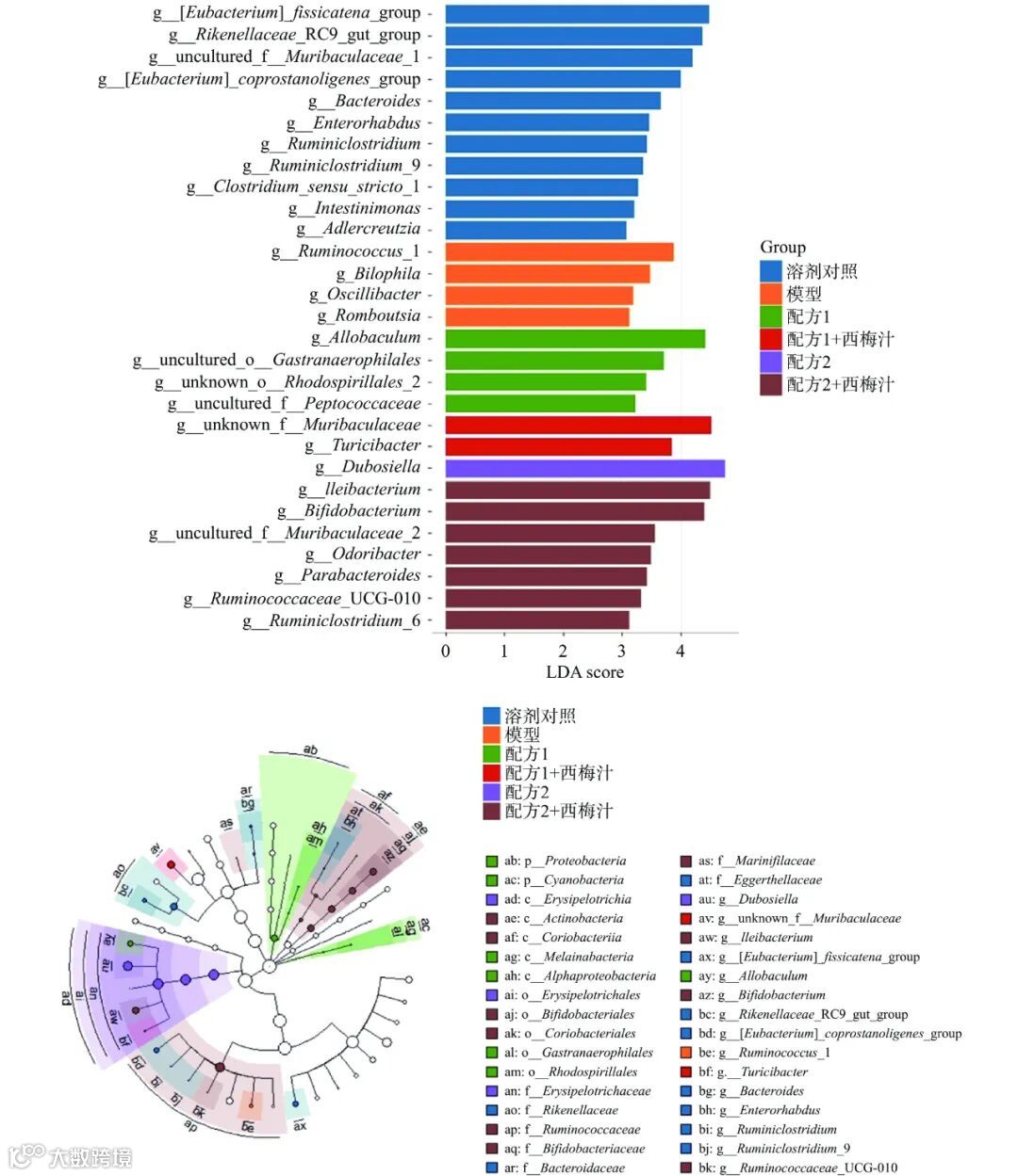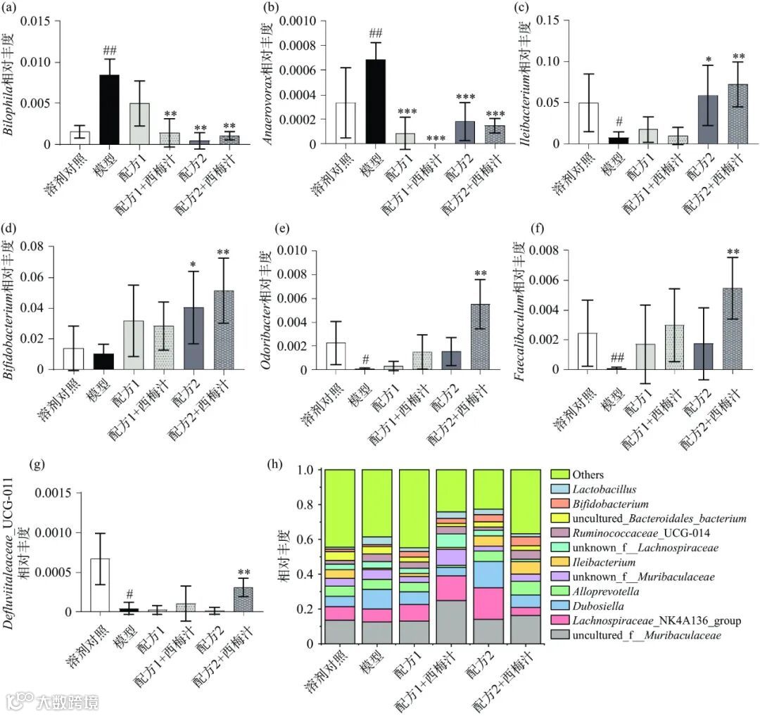 如图 7a~d 所示,结果显示,各组小鼠肠道菌群的 α-多样性没有显著差异。如图 7e 所示,β-多样性结果显示各组间无明显分离趋势。这可能是由于在本研究中溶剂对照组和模型组的肠道菌群多样性没有显著差异,需要进一步从关键差异菌属的角度进行分析便秘和复配配方对肠道菌群的影响。类似的,Meji 等也发现与健康人相比,便秘患者肠道菌群的多样性没有显著差异,需要通过岭回归等方法确定便秘患者肠道菌群的特征菌属。LEfSe 分析结果如图 8 所示,通过 LEfSe 分析发现了数个标志性菌属,模型组的标志性菌属有:Bilophila,Oscillibacter 和 Romboutsia。配方 1 组的标志性菌属有 Allobaculum。配方 1+西梅汁组的标志性菌属有 Turicibacter。配方 2 组的标志性菌属有 Dubosiella。配方 2+西梅汁组的标志性菌属有Ileibacterium, Bifidobacterium 和 Odoribacter 等 。为深入探究益生元配方和西梅汁对肠道菌群的具体调控作用,研究进一步分析了这些标志性菌属的相对丰度变化。