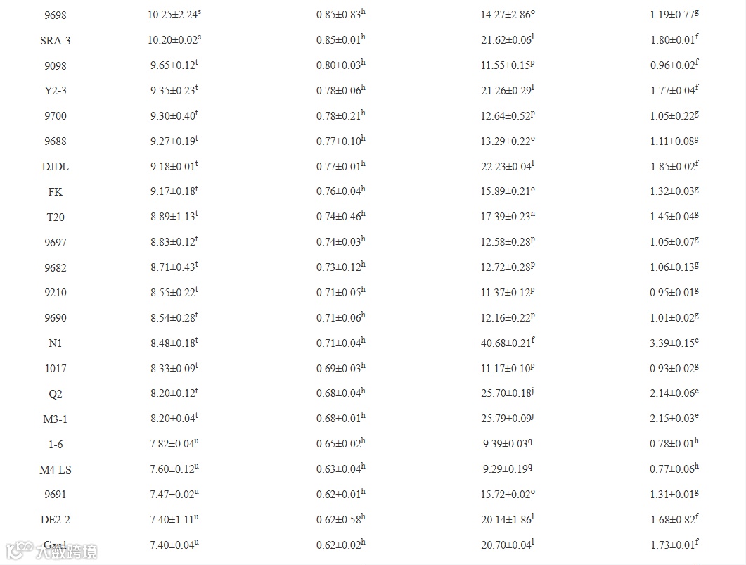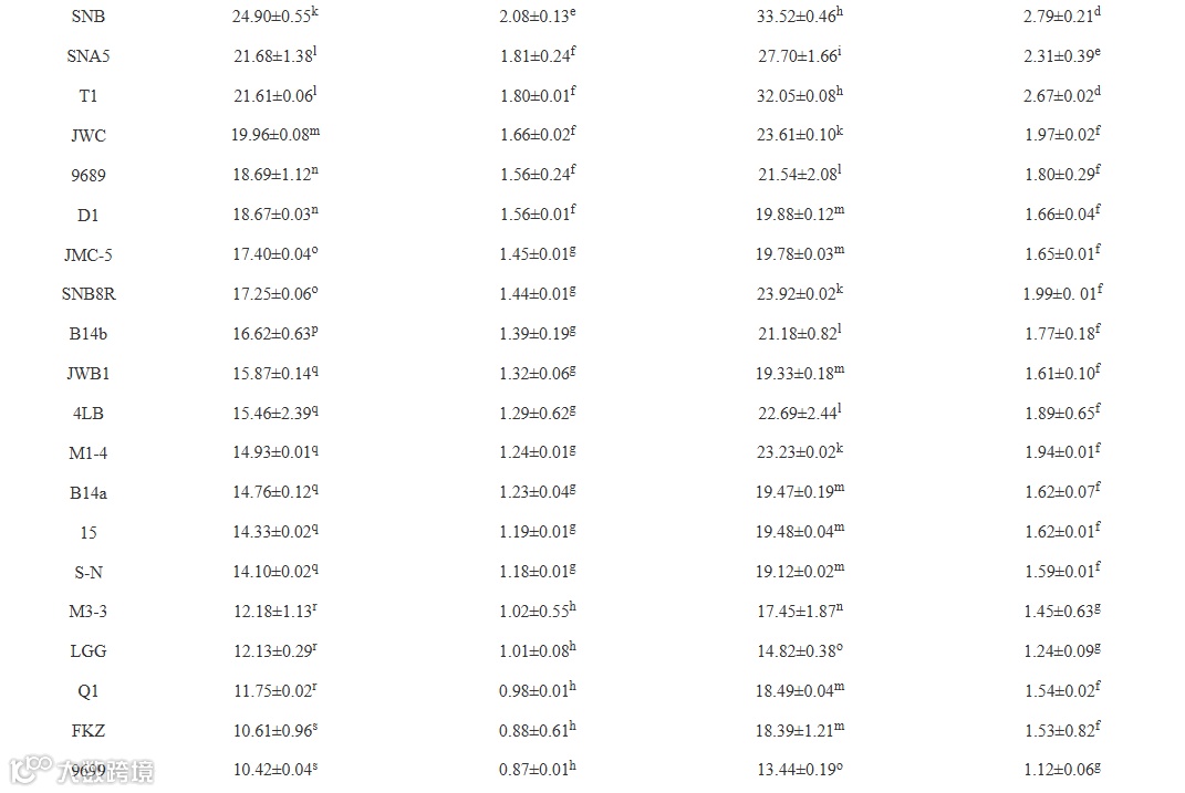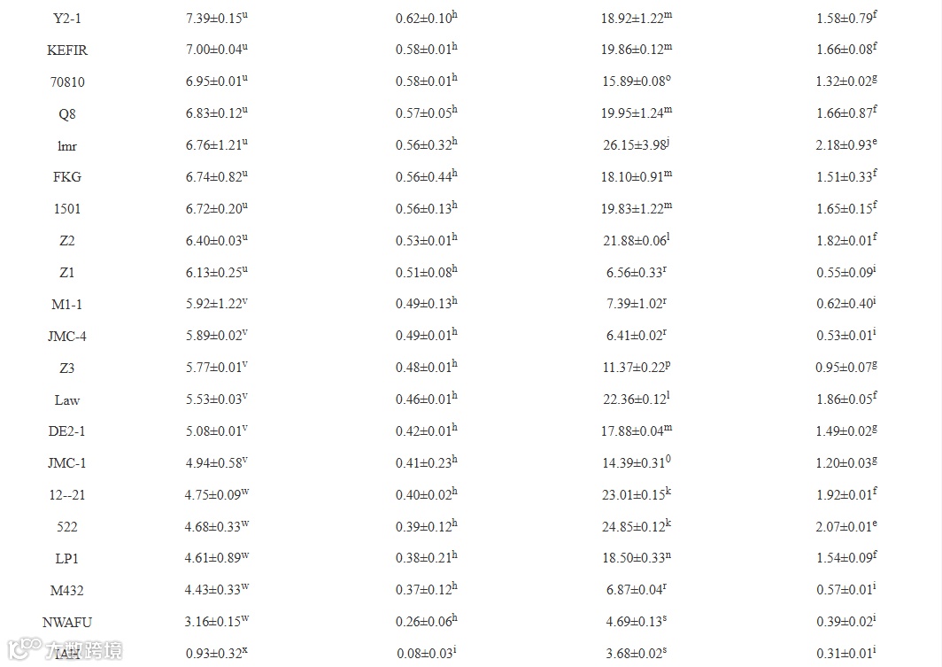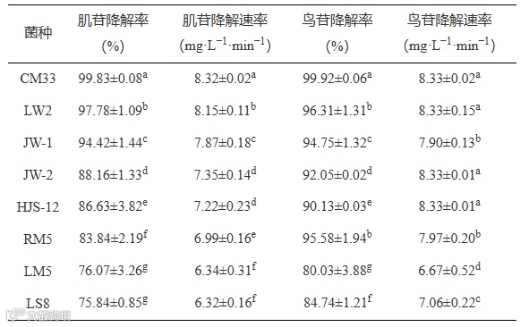 表 2 乳酸菌核苷降解能力分析(降解率<80%)