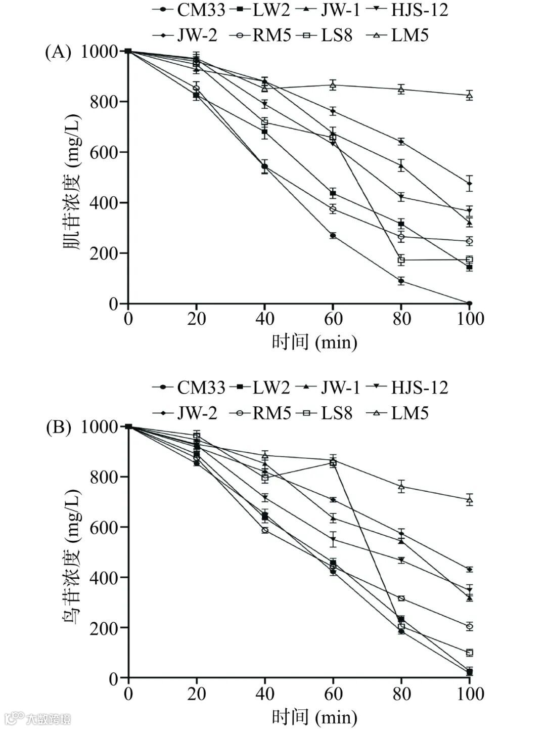 图 1 不同乳酸菌株降解肌苷(A)和鸟苷(B)能力比较
