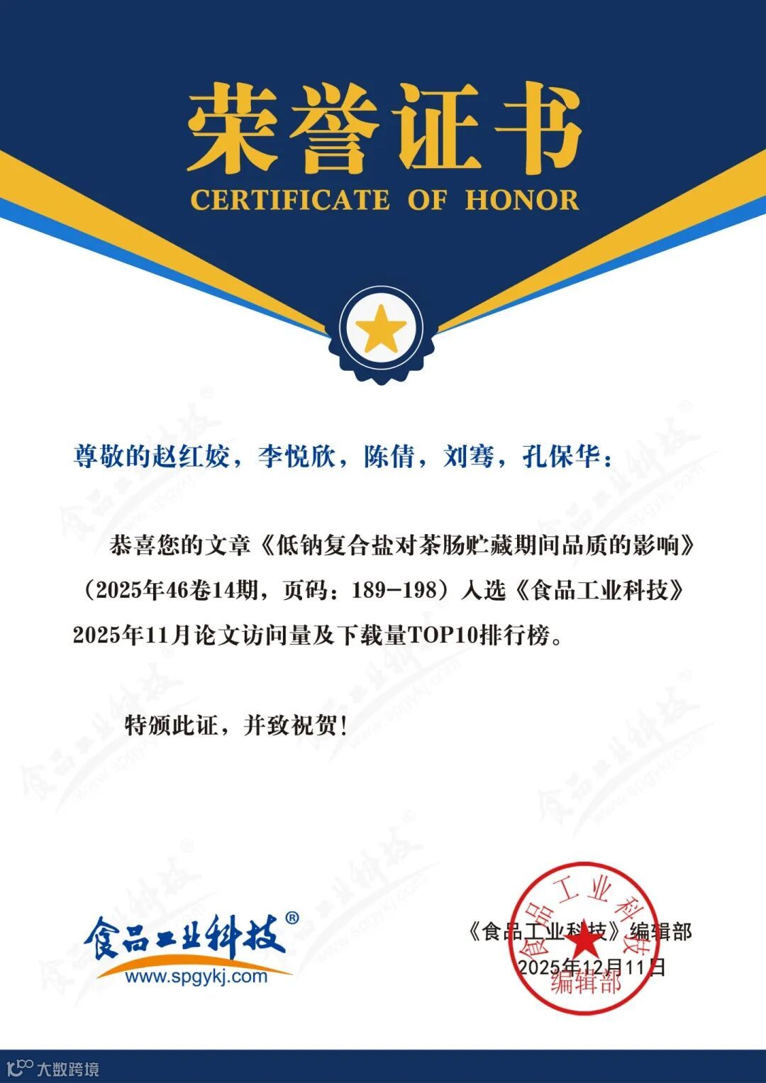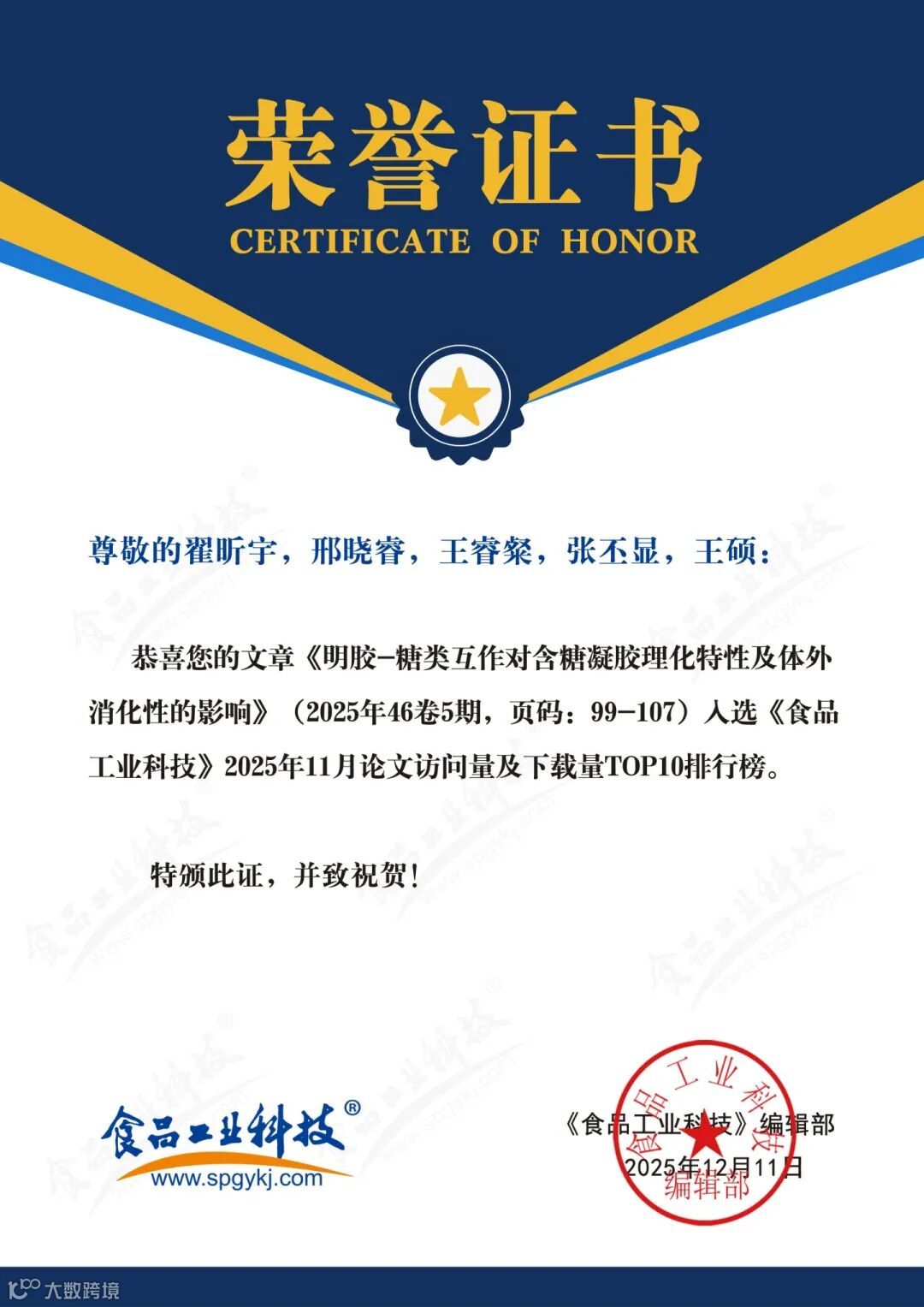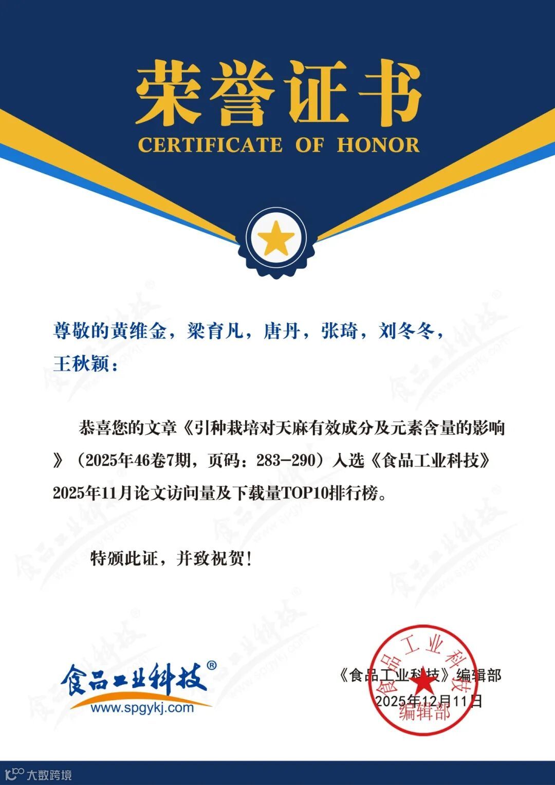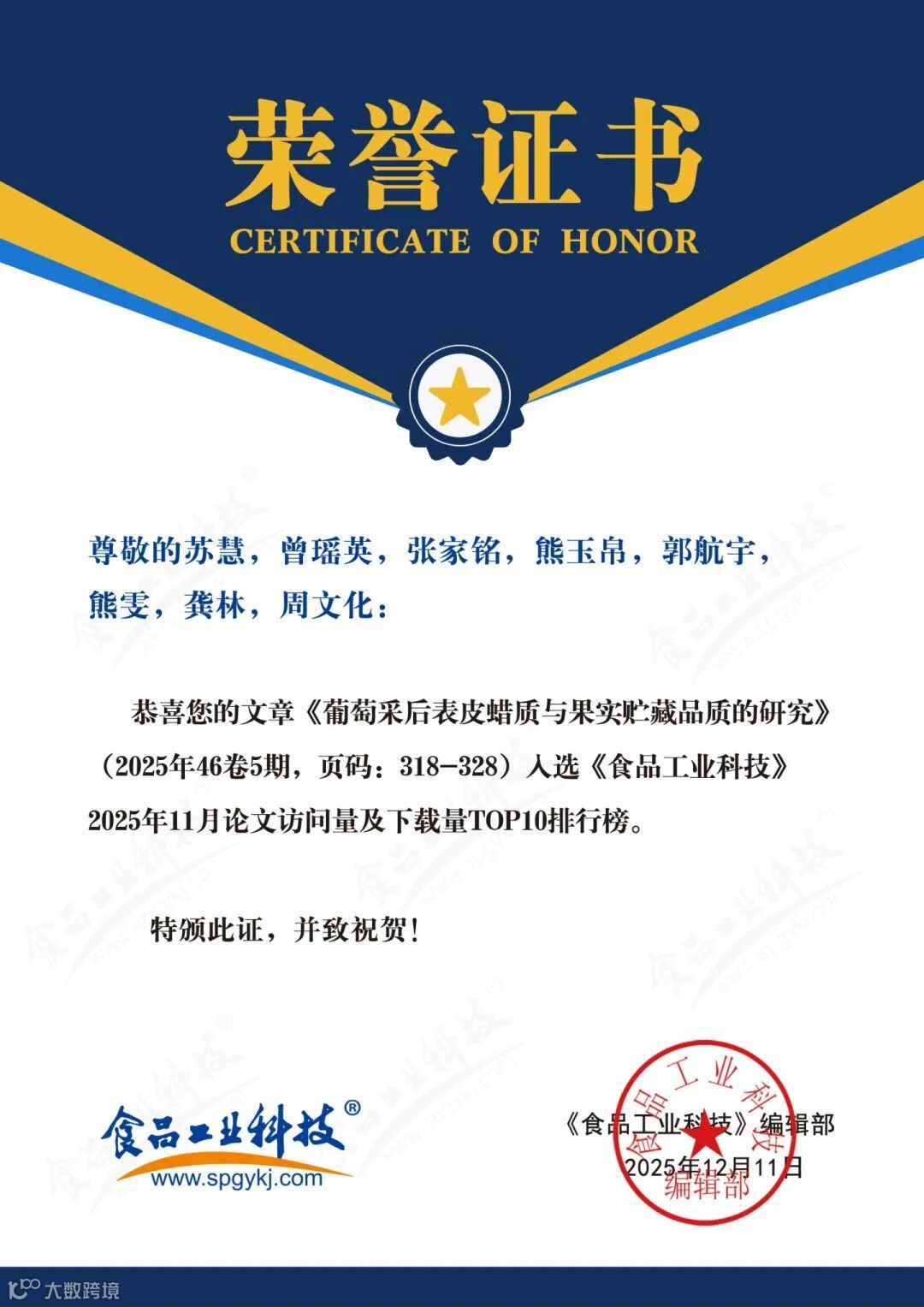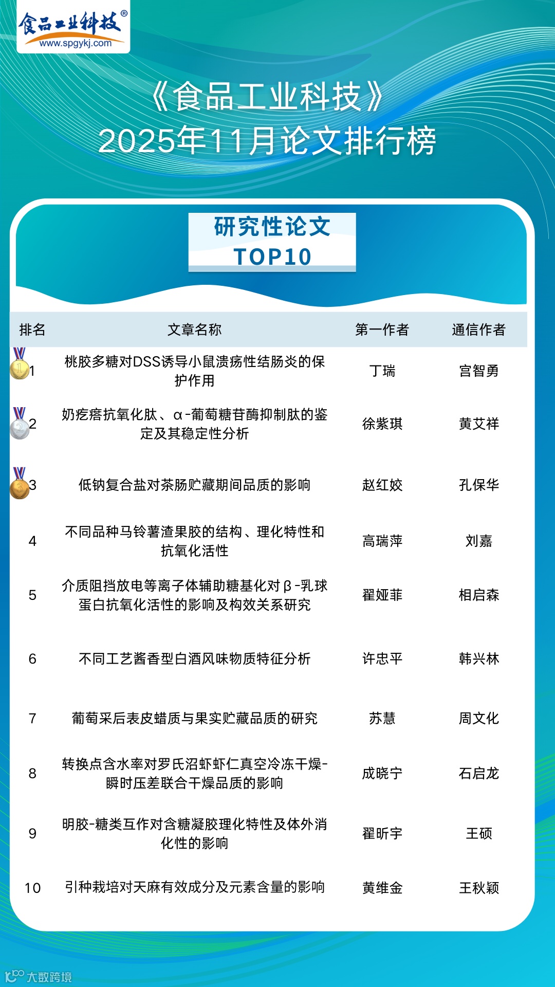 2025年12月11日,《食品工业科技》编辑部基于《食品工业科技》官网(http://www.spgykj.com/)数据,以《食品工业科技》自1979年见刊以来的全部论文为数据,统计2025年11月论文访问量及下载量排行榜TOP10,以对科学研究及食品学科发展起指导作用。