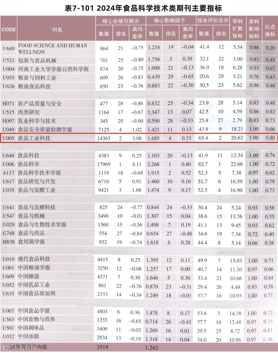 2025年12月,国家科技部中国科学技术信息研究所(中信所)发布了《2025年版中国科技期刊引证报告(核心版)》,其中2607本期刊入选,《食品工业科技》核心总被引频次排名15,综合排名221;食品科学技术类期刊总共有29本入选该科技核心期刊数据库,其中,《食品工业科技》综合评价总分达65.4,稳居食品科学技术类核心期刊第2。