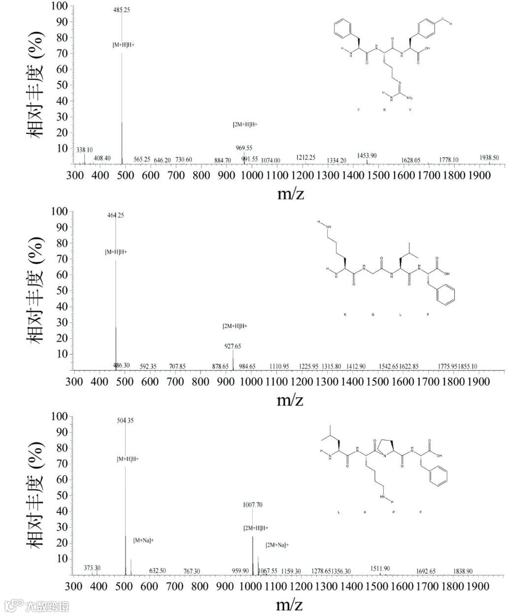图 7 FRY、KGLF和LKPF的质谱图及化学结构