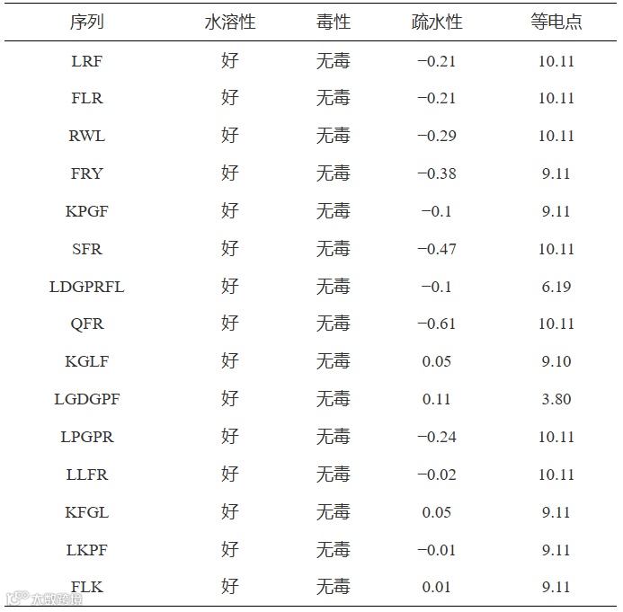 表 5 15条黑豆蛋白肽的水溶性、毒性、疏水性及等电点