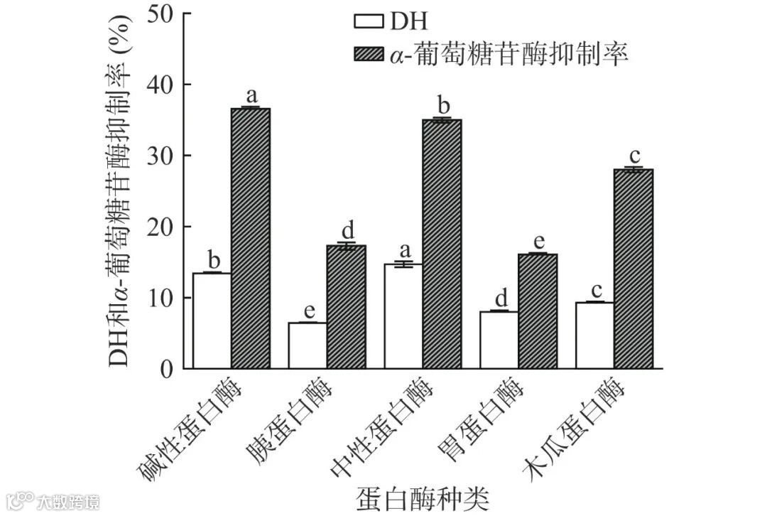图 1 五种蛋白酶对黑豆蛋白的水解度以及酶解产物的α-葡萄糖苷酶抑制率