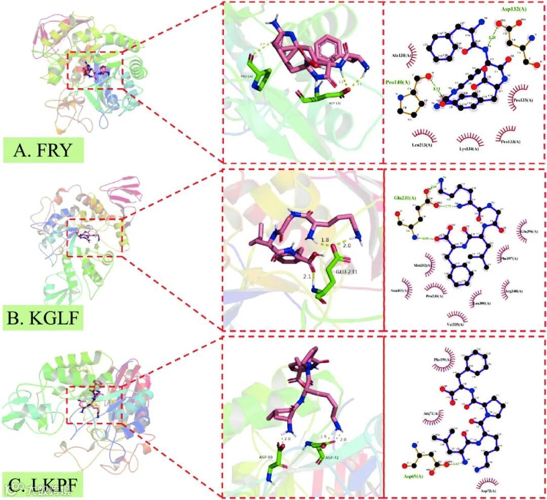 图 6 3 种肽与α-葡萄糖苷酶(PDB ID:3WY1)相互作用的分子对接模型