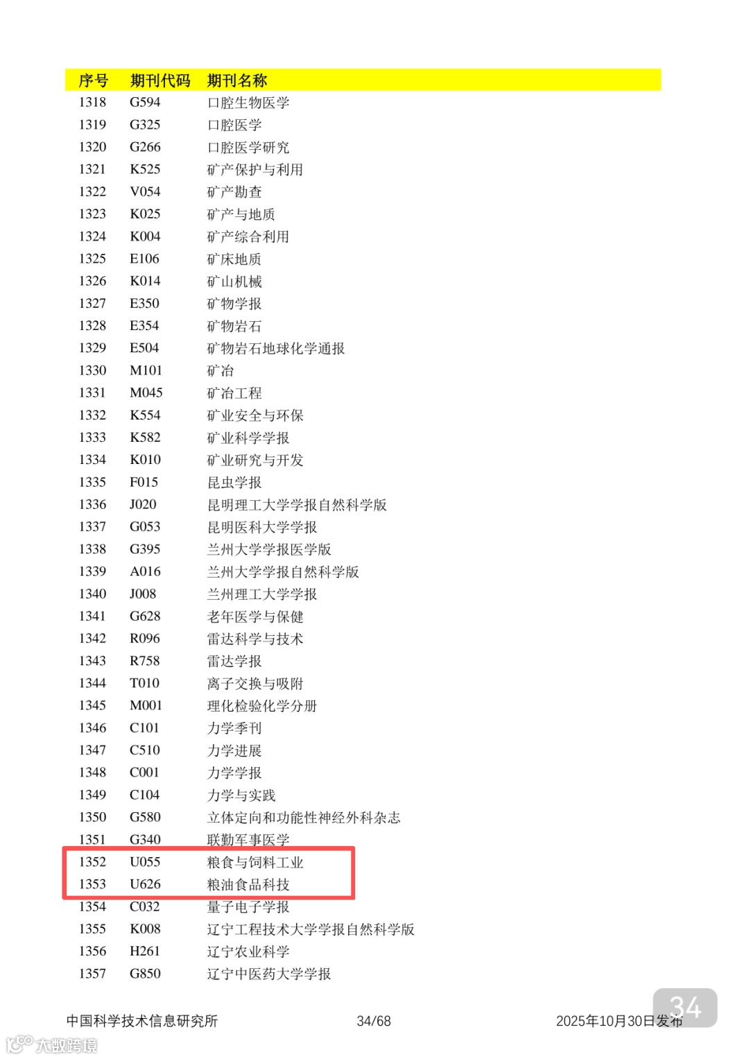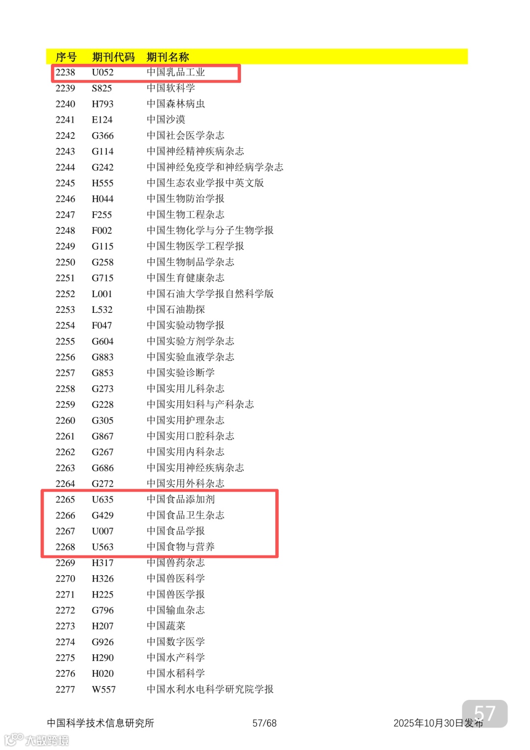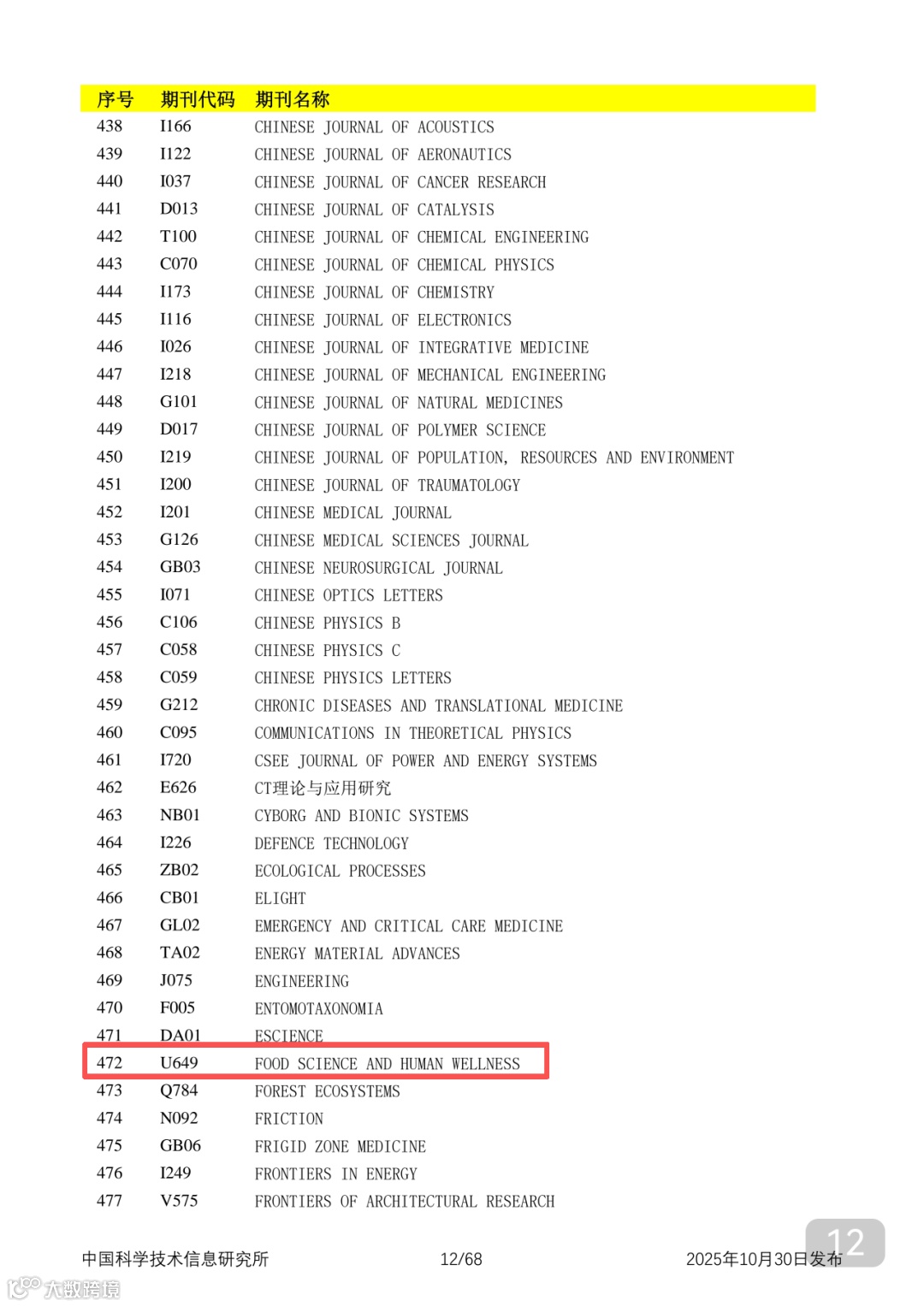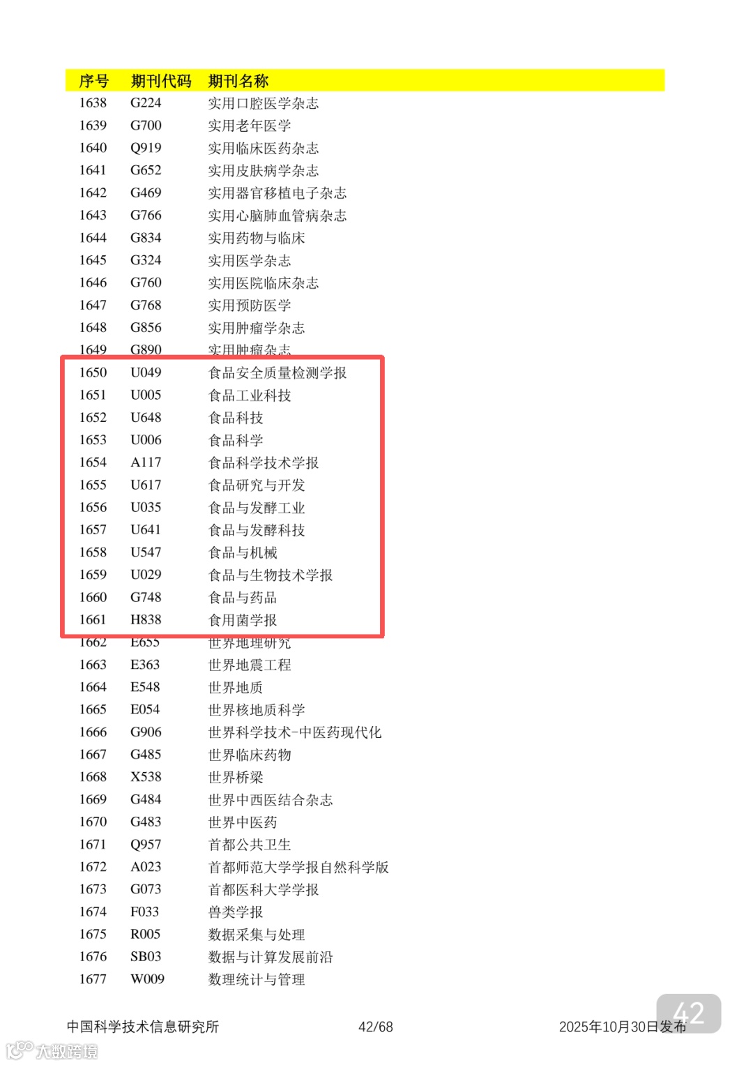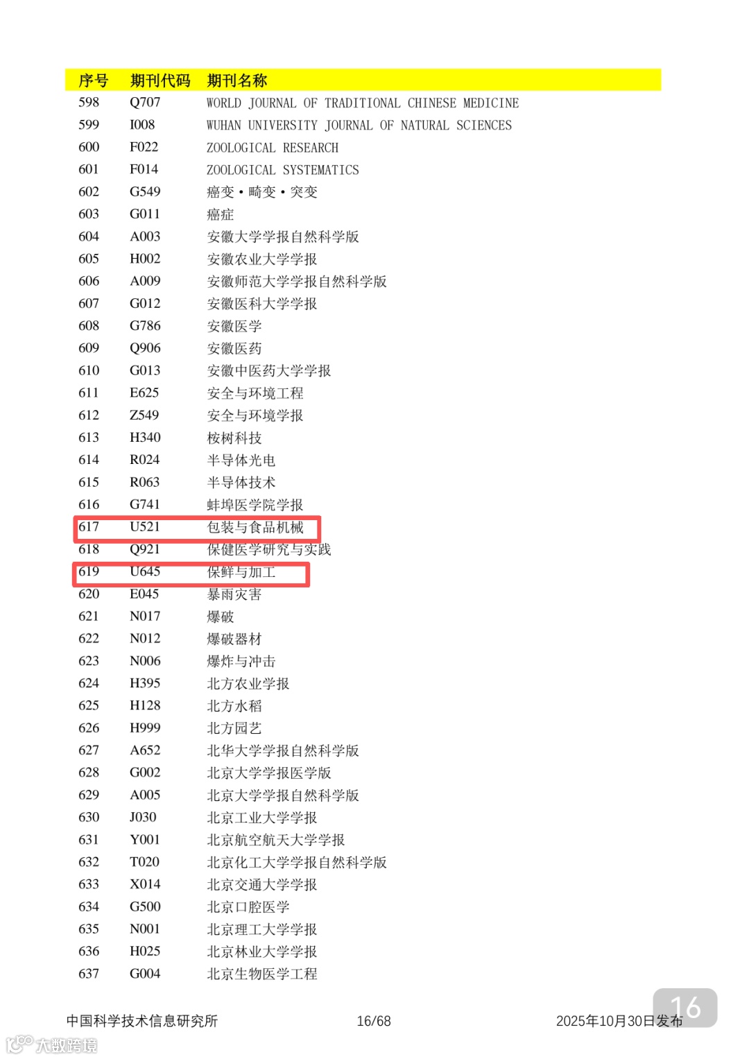 附2025年中国科技核心期刊目录,其中食品领域期刊以红线框出(人工整理,如有遗漏,敬请谅解)。