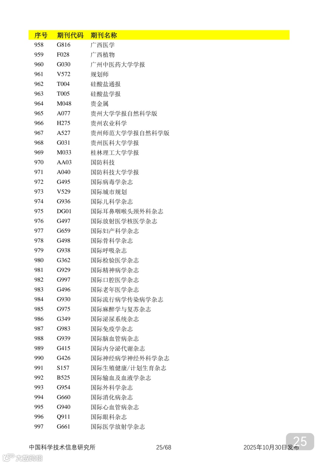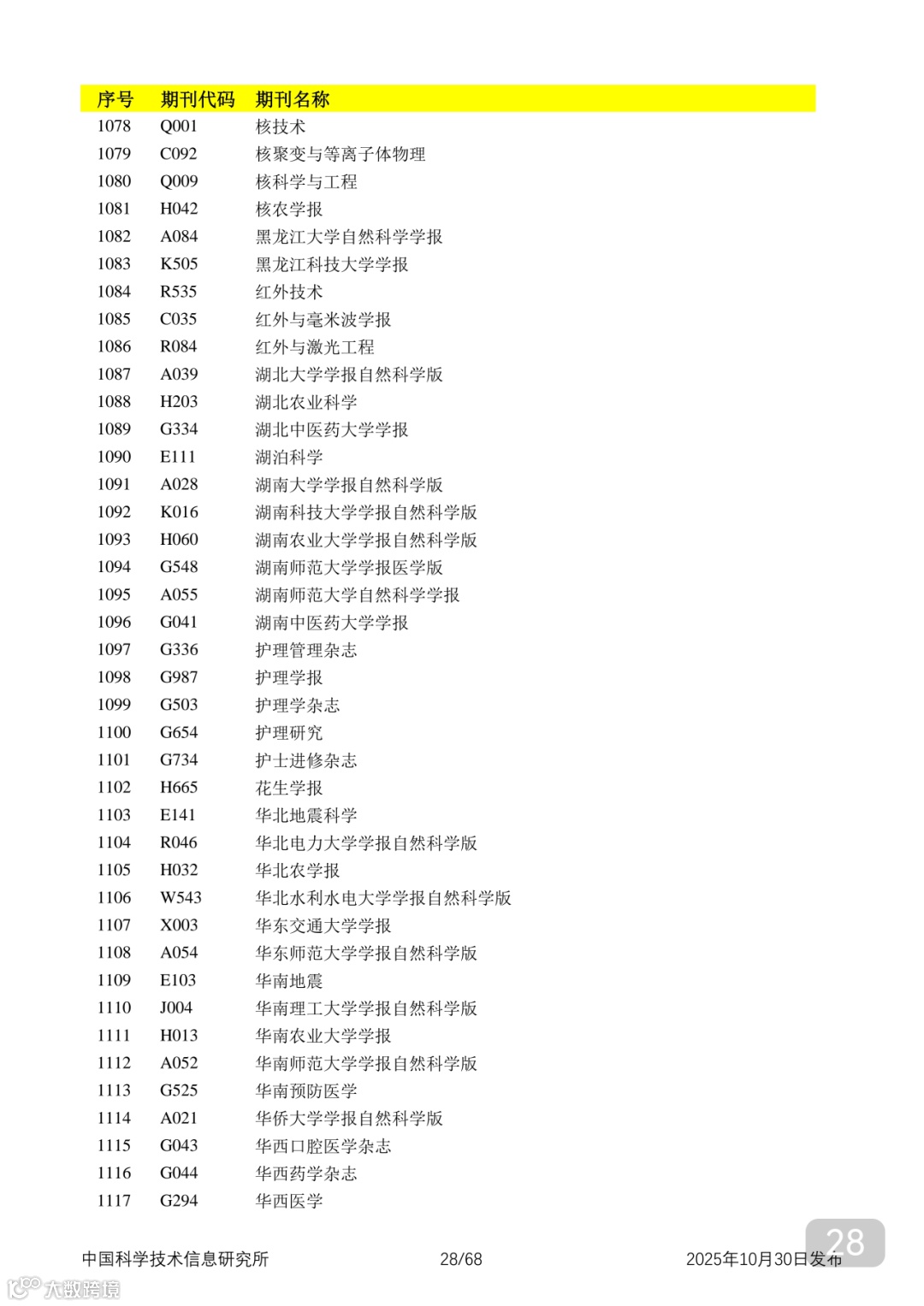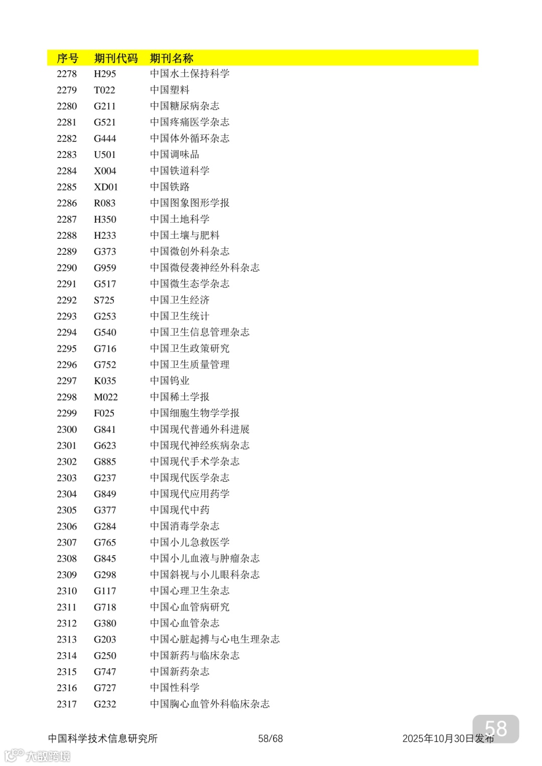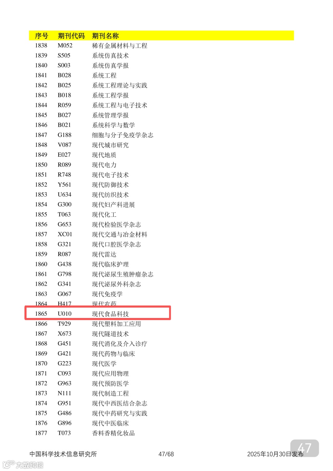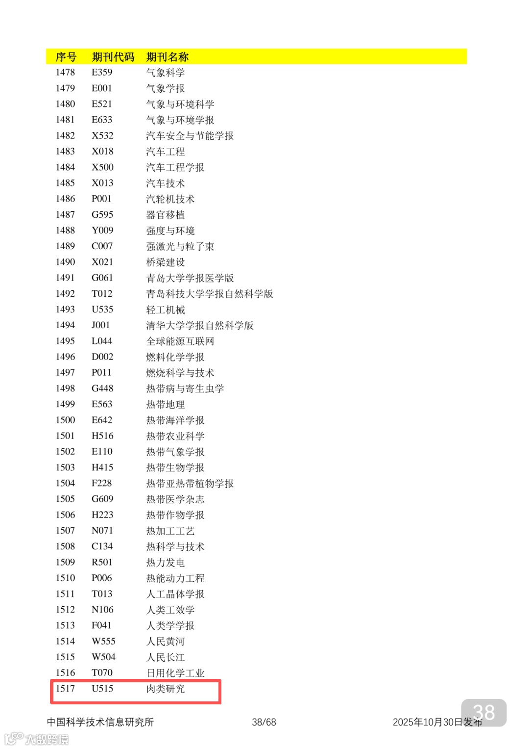 附2025年中国科技核心期刊目录,其中食品领域期刊以红线框出(人工整理,如有遗漏,敬请谅解)。