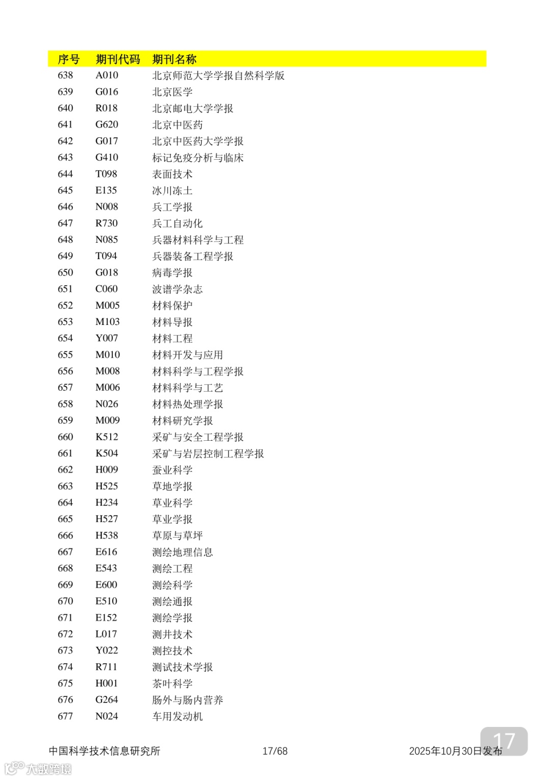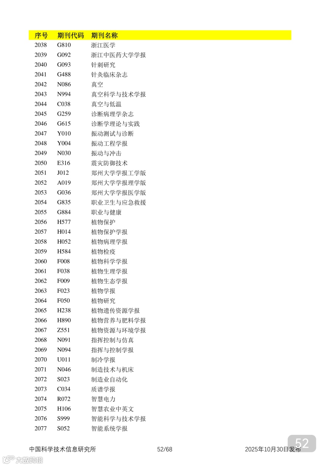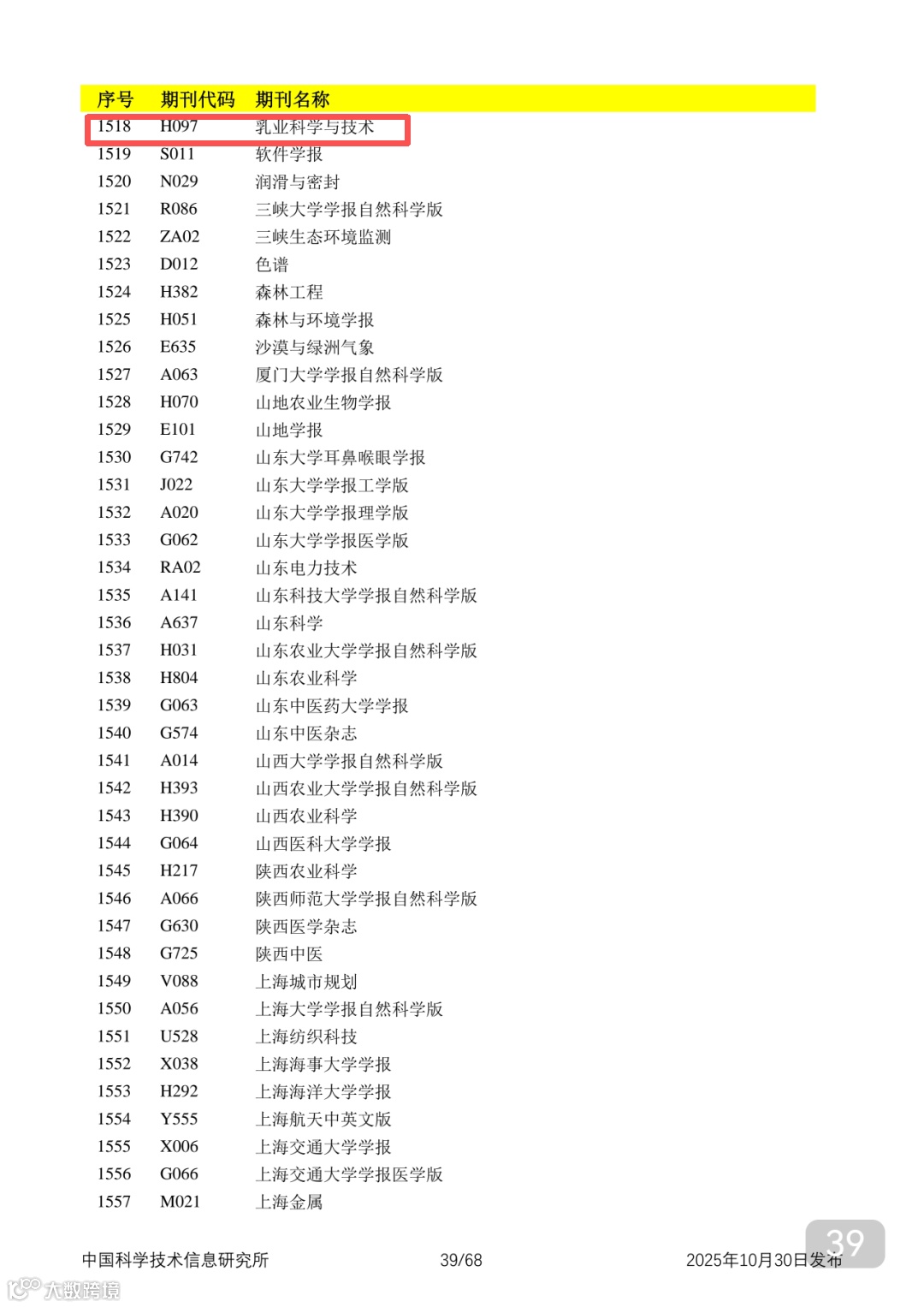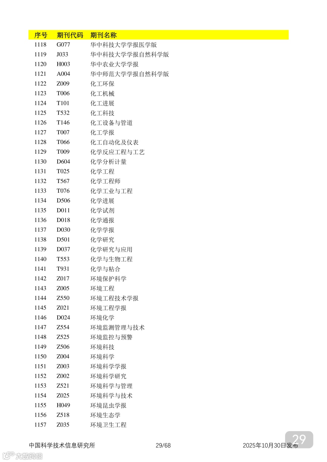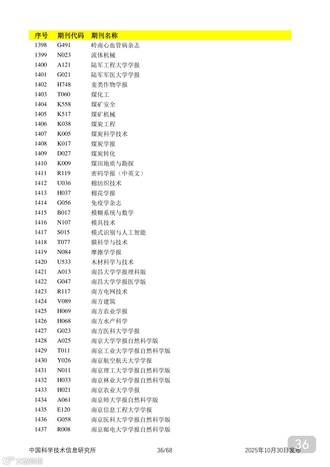 附2025年中国科技核心期刊目录,其中食品领域期刊以红线框出(人工整理,如有遗漏,敬请谅解)。