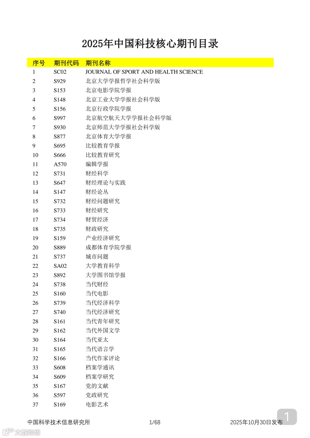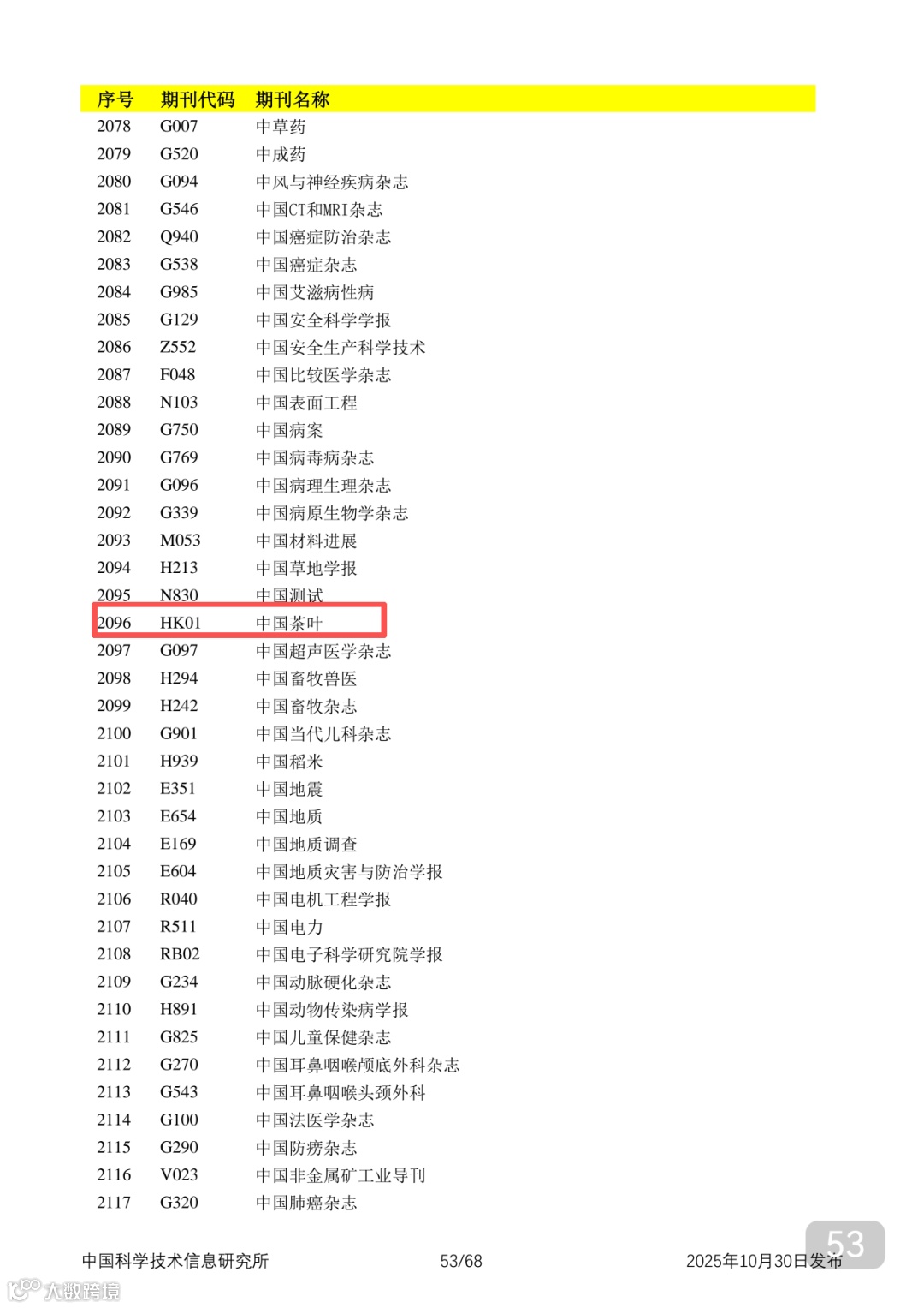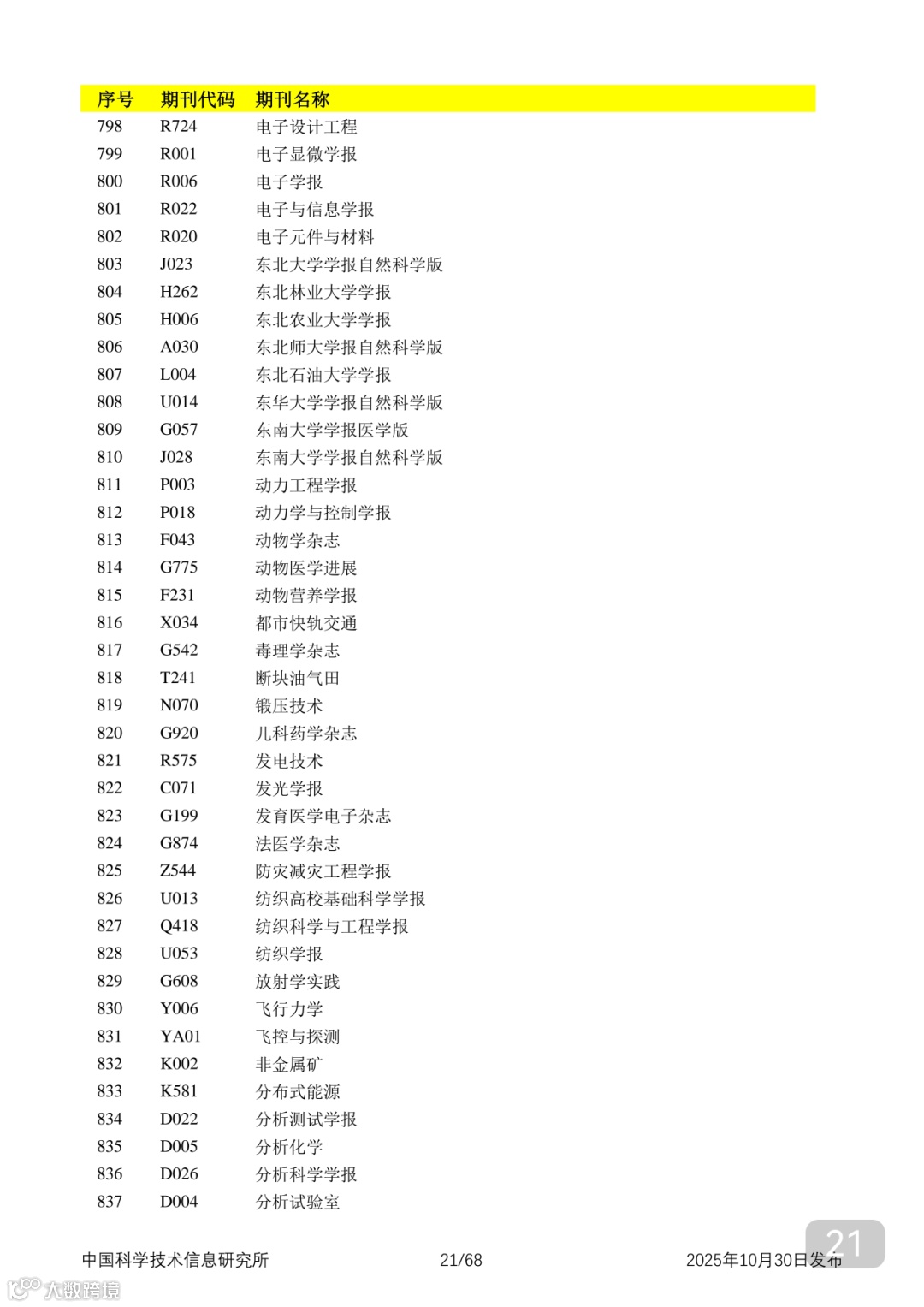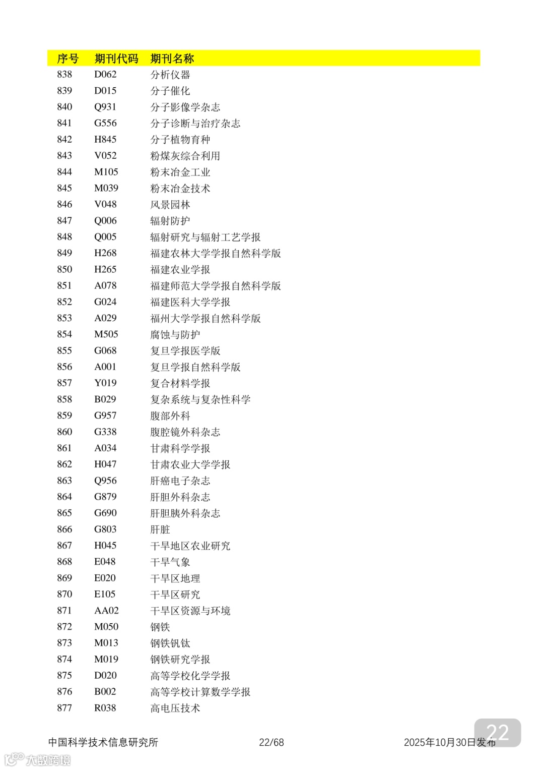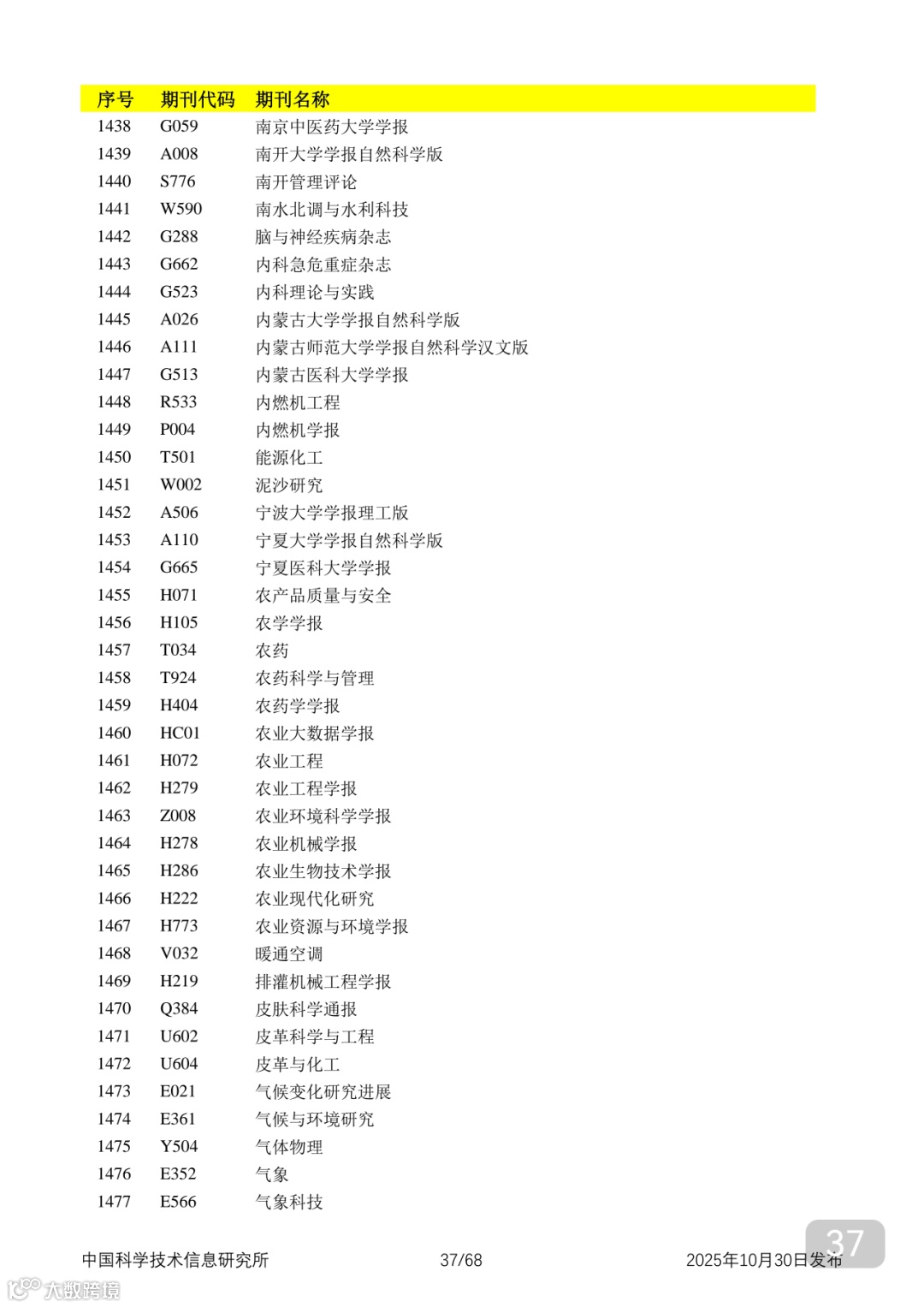 附2025年中国科技核心期刊目录,其中食品领域期刊以红线框出(人工整理,如有遗漏,敬请谅解)。