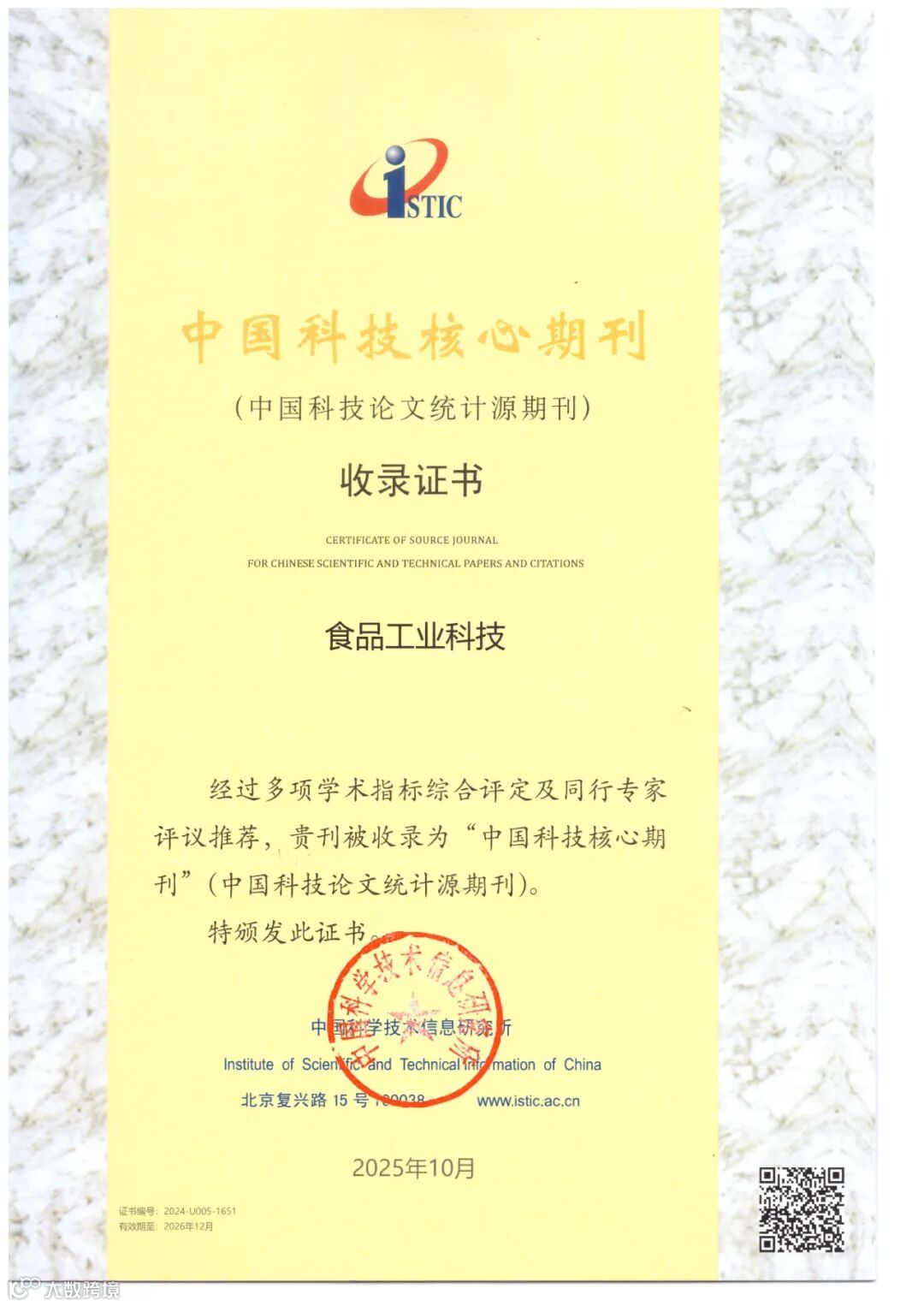 10月30日,中国科学技术信息研究所公布了最新一期中国科技核心期刊(中国科技论文统计源期刊)的评选结果,《食品工业科技》凭借其食品工程领域的卓越表现和学术影响力,再次荣耀入选。