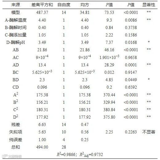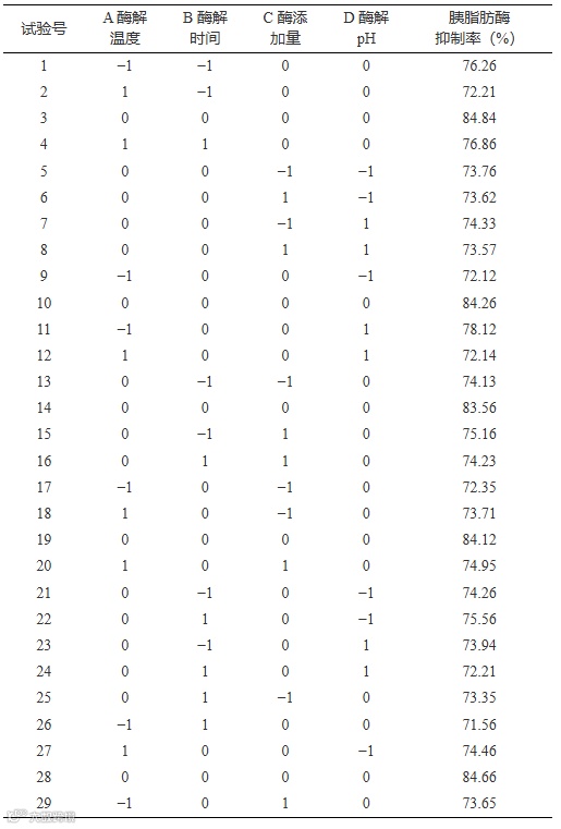 本实验以酶解温度(A)、酶解时间(B)、酶添加量(C)、酶解pH(D)4个因素作为自变量,以胰脂肪酶抑制率为响应值,设计4因素3水平试验。设计方案及试验结果见表3。