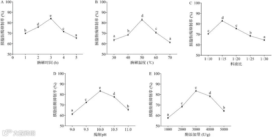 由图2(B)可知,胰脂肪酶抑制率随酶解温度升高呈先增加后降低的趋势,在酶解温度为50 ℃时达到最高为83.02%±0.88%。推测与酶的最适温度有关,温度过高会使蛋白酶失活,导致酶解速率下降。因此,选择酶解温度为50 ℃进行下一步实验。