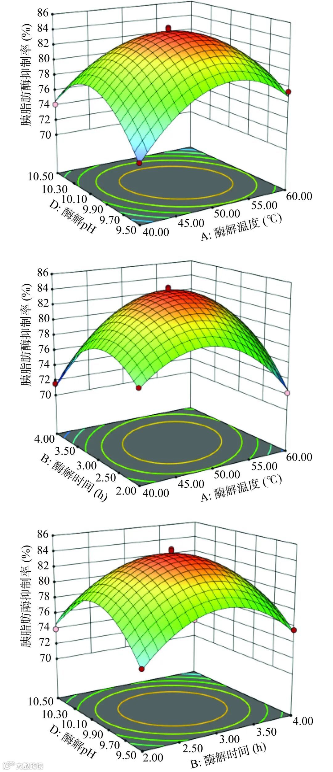 响应面结果如图3所示。各因素交互对胰脂肪酶抑制率的影响均呈现先升高后降低的趋势,在响应面图中出现最大值,AB、AD、BD两因素交互等高线图呈现椭圆形,说明两因素交互作用显著,这与方差分析表中结果一致,在一定的酶解时间下,随酶解pH和酶解温度的增加,响应曲面迅速变化,说明WKBPs抑制胰脂肪酶主要受酶解pH和酶解温度的影响。