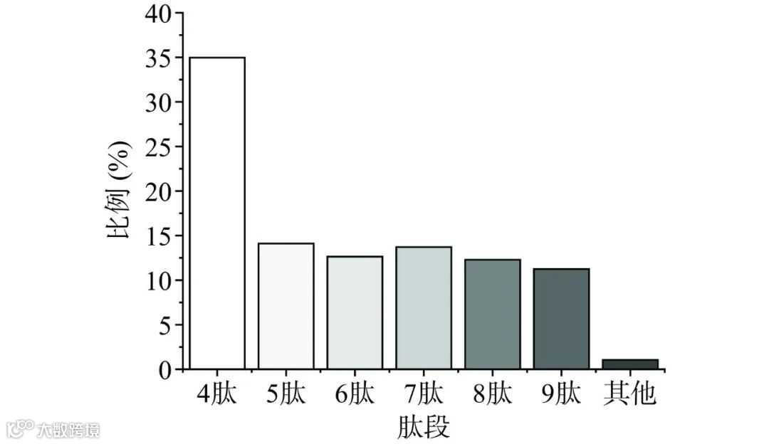 为探究白芸豆降血脂肽具体的氨基酸序列,对MW<3000 Da的WKBPs用LC-MS/MS进行序列鉴定。WKBPs一级质谱图和肽段比例分布图如图9和图10所示,在WKBPs-3中共检测出2997条肽段,其中4肽、5肽、6肽、7肽占比约75%。
