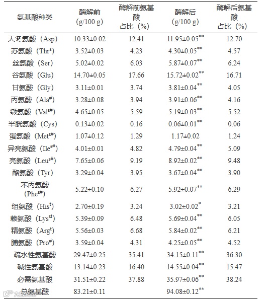 氨基酸的组成以及在肽链上的排列顺序与活性肽的功能作用密切相关,据报道,疏水性氨基酸(缬氨酸、亮氨酸等)可调节脂蛋白代谢,与脂肪酶的活性位点结合,改变其空间构象,从而抑制脂肪酶的活性,减少脂肪的水解和吸收,本实验对白芸豆蛋白水解前后氨基酸组成成分变化进行分析,结果如表5所示,在WKBPs中检测出17种氨基酸,其中疏水性氨基酸有7种,与未水解的白芸豆蛋白相比,水解之后的白芸豆必需氨基酸从31.51±0.22 g/100 g极显著增加到35.97±0.06 g/100 g(P<0.01),必需氨基酸占比从37.88%增加到38.24%;疏水性氨基酸从29.47±0.25 g/100 g极显著增加到34.15±0.11 g/100 g(P<0.01),氨基酸占比从35.41%增加到36.30%;总氨基酸含量从83.21±0.11 g/100 g极显著增加到94.08±0.12 g/100 g(P<0.01)。有研究表明疏水性氨基酸能与胆汁酸形成不溶性混合物通过肠道排出体外,疏水性氨基酸含量越高,对人体内胆固醇调节作用越显著。因此可推测WKBPs具有一定的调节血脂异常的能力。