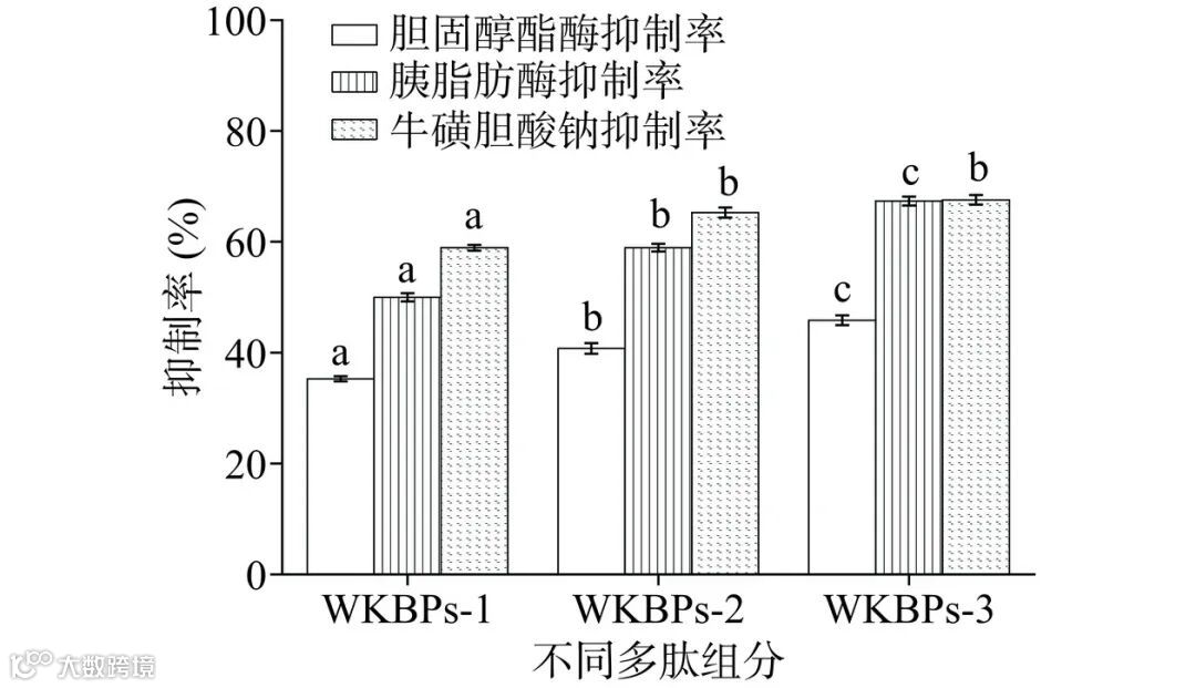 经超滤后将WKBPs按照分子量大小进行分离,将其分成WKBPs-1(Mw>5 kDa)、WKBPs-2(3 kDa<Mw<5 kDa)、WKBPs-3(Mw<3 kDa)3个组分,结果如图5所示,各组间存在显著差异(P<0.05),当浓度为1 mg/mL时,Mw<3 kDa的WKBPs对胆固醇酯酶、牛磺胆酸钠、胰脂肪酶的抑制作用最好,分别为45.85%±0.89%、67.56%±0.86%、67.35%±0.79%,可推测出低分子量的多肽组分可能暴露出更多的活性位点而表现出更好的酶活性抑制作用,因此,选择Mw<3000 Da组分进行后续实验。