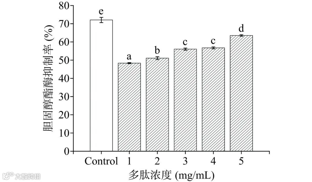 胆固醇酯酶将食物水解转化为胆固醇,胆固醇溶解在胶束中被人体吸收,所以对胆固醇酯酶的抑制可以降低对胆固醇的吸收。如图6所示,随着WKBPs-3浓度的增加,对胆固醇酯酶的抑制作用显著增加(P<0.05),在5 mg/mL时对胆固醇酯酶的抑制率达到最高为63.52%,低于阳性对照辛伐他汀,其IC50值为1.43 mg/mL,随着浓度的增加抑制作用越明显,这是由于在一定的质量浓度范围内,多肽分子越多,与胆固醇酯酶接触面积越大,能够使更多的胆固醇酯酶被破坏,从而达到抑制血脂的作用,WKBPs-3的胆固醇酯酶的抑制率更强,表明WKBPs-3具有较好的胆固醇酯酶抑制能力。