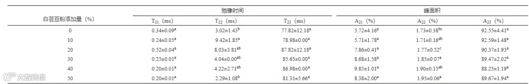 Table 4 Effect of white kidney bean powder on the water relaxation time T2 and the corresponding peak area