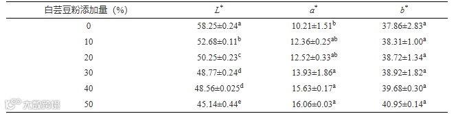 表 6 不同添加量白芸豆苏打饼干的色差分析