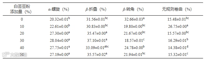 Table 5 Effect of added amount of white kidney bean powder on biscuit protein secondary structure
