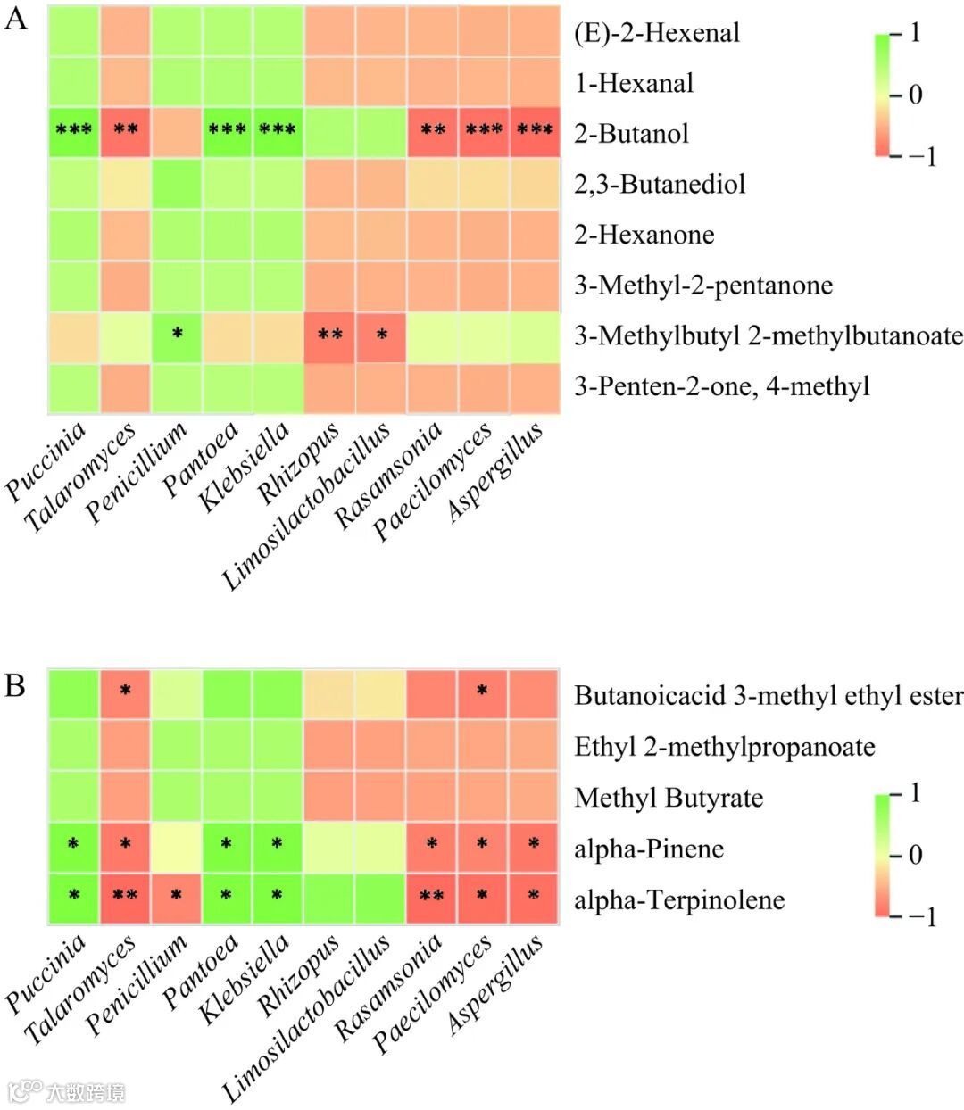 为了探究挥发性风味化合物与麦曲微生物之间的关系,将不同麦曲和不同黄酒中上调倍数Top5的挥发性风味化合物与麦曲中丰度占比前10的优势微生物作相关性分析,结果如图7所示。黄精麦曲中上调的锈菌属(Puccinia)、泛菌属(Pantoea)及克雷伯氏菌属(Klebsiella)与麦曲中反-2-己烯醛、1-己醛、2,3-丁二醇等风味化合物均具有不同程度的正相关性,与2-丁醇则具有极显著的正相关性。而在HJ100和HJ200中丰度较低的微生物,如罗萨氏菌属(Rasamsonia)、拟青霉属(Paecilomyces)则与上述风味化合物表现出负相关(图7A)。不同黄酒的风味化合物与微生物间的相关性也有类似现象,PTMQ-W、HJ100-W及HJ200-W中的3-丁酸-甲基乙酯、异丁酸乙酯、α-蒎烯等风味化合物与Puccinia、Pantoea及Klebsiella表现出一定的正相关性,同时与篮状菌属(Talaromyces)、Rasamsonia及Paecilomyces等表现出负相关(图7B)。