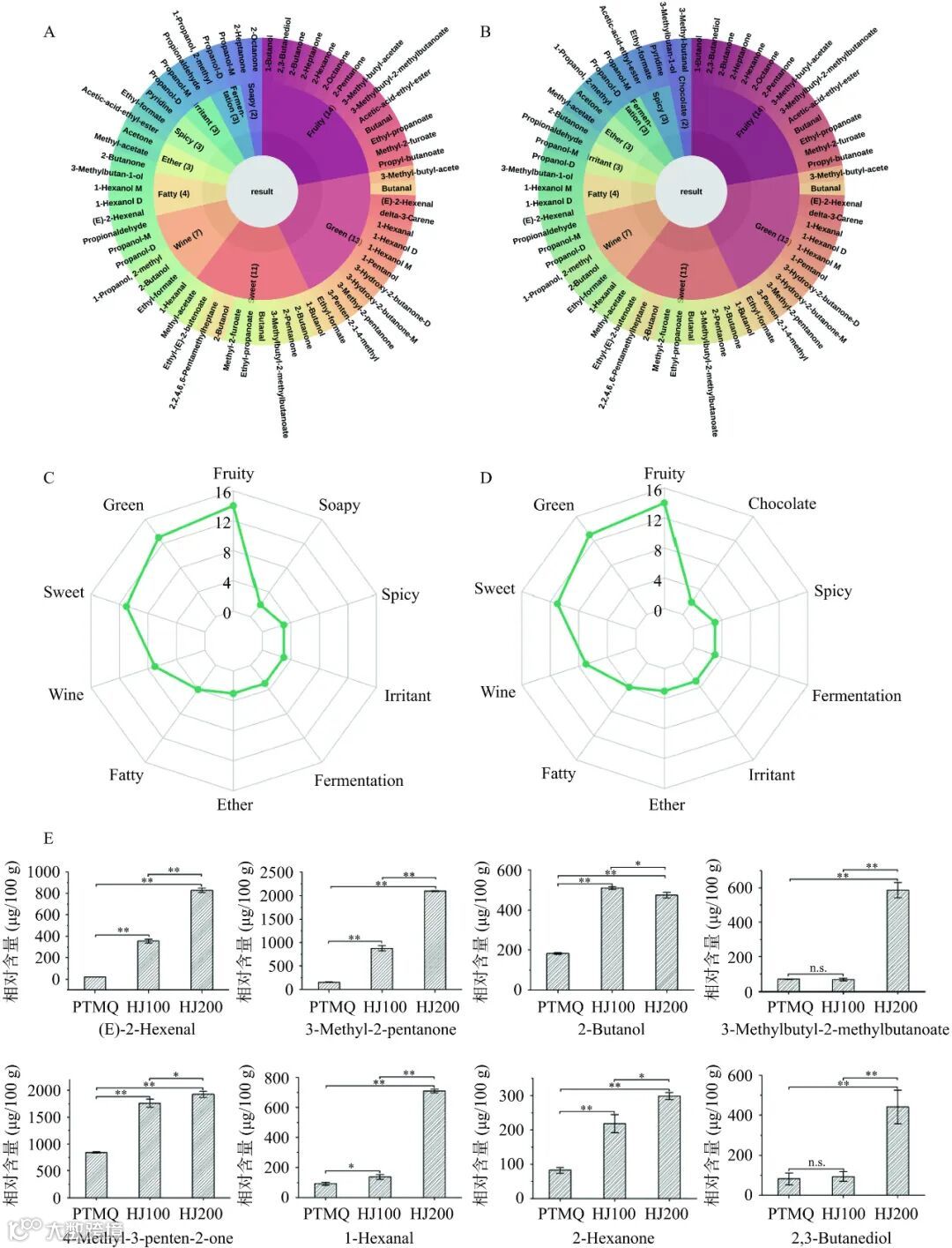 注:PTMQ/HJ100比较组风味轮(A)和雷达图(C);PTMQ/HJ200比较组风味轮(B)和雷达图(D);HJ100和HJ200中上调幅度Top5的部分风味化合物(E)。*P<0.05,**P<0.01。