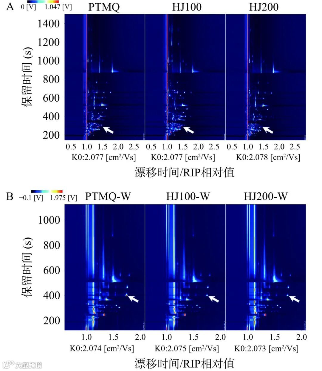 Figure 1. GC-IMS 2-dimensional spectrum of different wheat Qu (A) and their brewed Huangjiu (B)