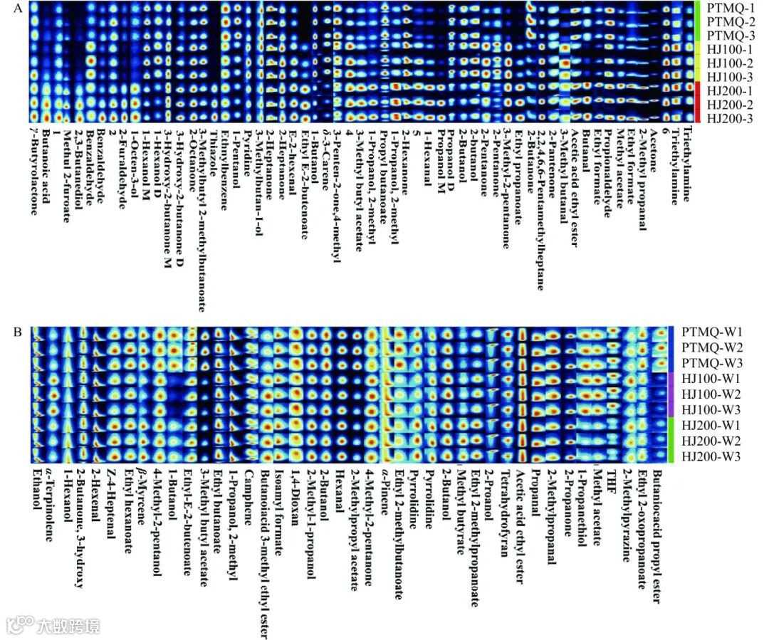 图 2 不同麦曲(A)及其酿造黄酒(B)的GC-IMS指纹图谱